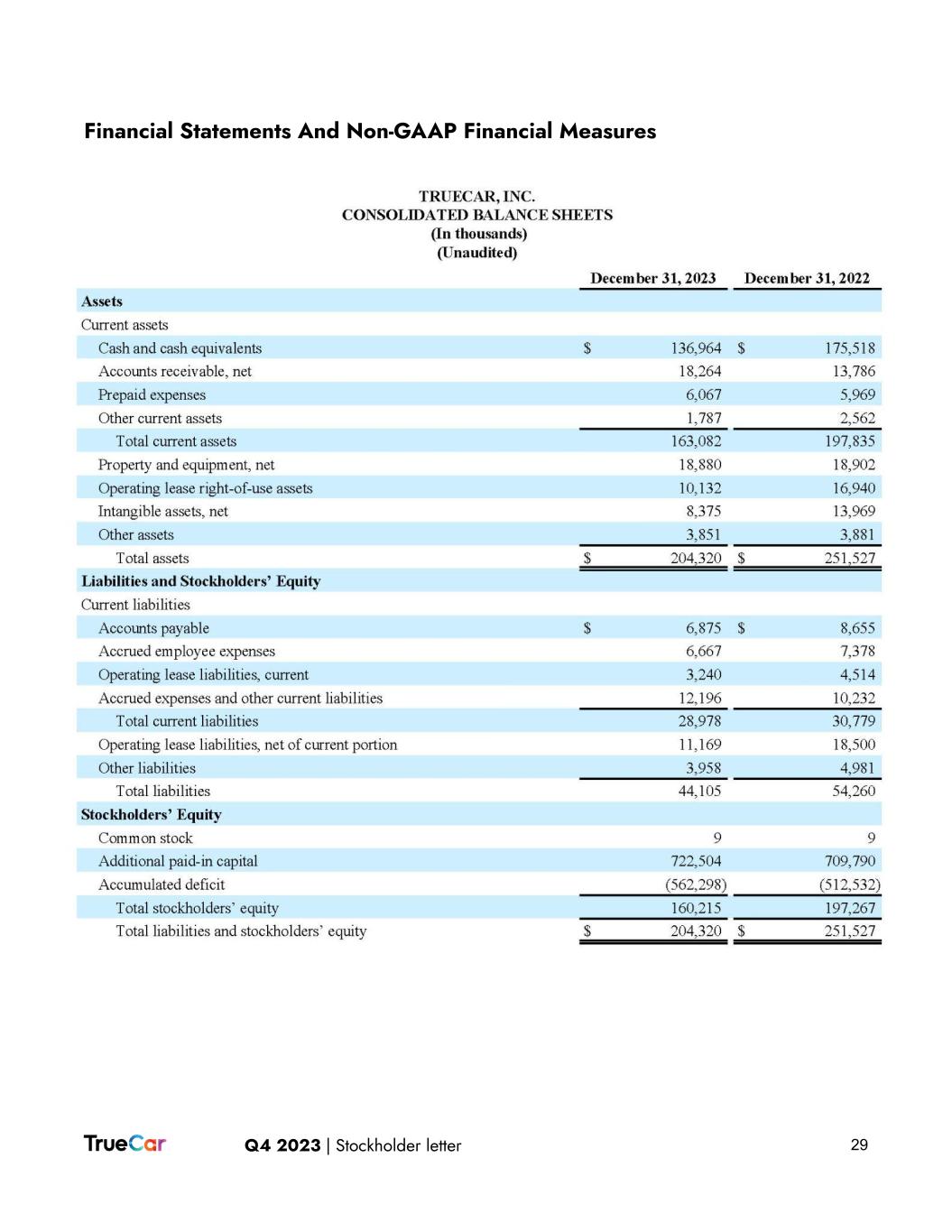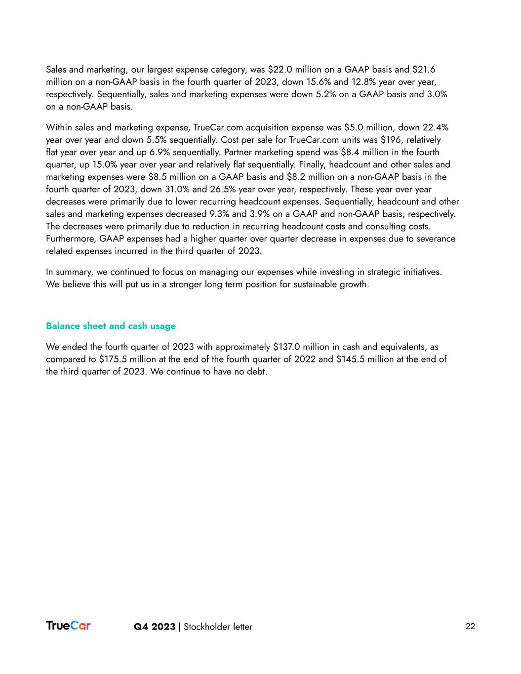 Q4 2023 | Stockholder letter 22 Sales and marketing, our largest expense category, was $22.0 million on a GAAP basis and $21.6 million on a non-GAAP basis in the fourth quarter of 2023, down 15.6% and 12.8% year over year, respectively. Sequentially, sales and marketing expenses were down 5.2% on a GAAP basis and 3.0% on a non-GAAP basis. Within sales and marketing expense, TrueCar.com acquisition expense was $5.0 million, down 22.4% year over year and down 5.5% sequentially. Cost per sale for TrueCar.com units was $196, relatively flat year over year and up 6.9% sequentially. Partner marketing spend was $8.4 million in the fourth quarter, up 15.0% year over year and relatively flat sequentially. Finally, headcount and other sales and marketing expenses were $8.5 million on a GAAP basis and $8.2 million on a non-GAAP basis in the fourth quarter of 2023, down 31.0% and 26.5% year over year, respectively. These year over year decreases were primarily due to lower recurring headcount expenses. Sequentially, headcount and other sales and marketing expenses decreased 9.3% and 3.9% on a GAAP and non-GAAP basis, respectively. The decreases were primarily due to reduction in recurring headcount costs and consulting costs. Furthermore, GAAP expenses had a higher quarter over quarter decrease in expenses due to severance related expenses incurred in the third quarter of 2023. In summary, we continued to focus on managing our expenses while investing in strategic initiatives. We believe this will put us in a stronger long term position for sustainable growth. Balance sheet and cash usage We ended the fourth quarter of 2023 with approximately $137.0 million in cash and equivalents, as compared to $175.5 million at the end of the fourth quarter of 2022 and $145.5 million at the end of the third quarter of 2023. We continue to have no debt.