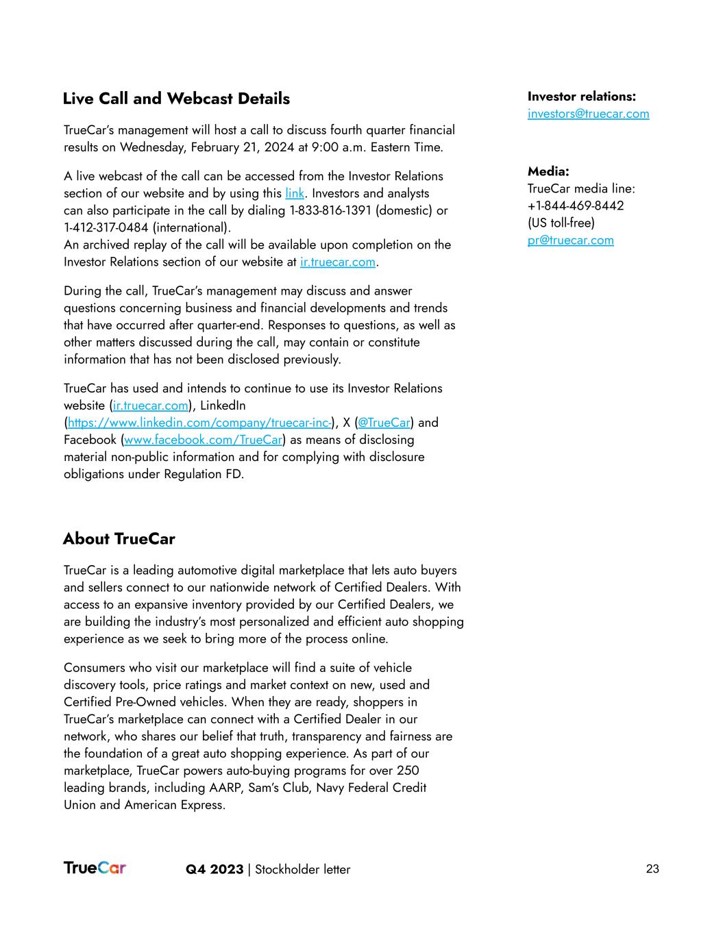 Q4 2023 | Stockholder letter 23 Investor relations: investors@truecar.com Media: TrueCar media line: +1-844-469-8442 (US toll-free) pr@truecar.com Live Call and Webcast Details TrueCar’s management will host a call to discuss fourth quarter financial results on Wednesday, February 21, 2024 at 9:00 a.m. Eastern Time. A live webcast of the call can be accessed from the Investor Relations section of our website and by using this link. Investors and analysts can also participate in the call by dialing 1-833-816-1391 (domestic) or 1-412-317-0484 (international). An archived replay of the call will be available upon completion on the Investor Relations section of our website at ir.truecar.com. During the call, TrueCar’s management may discuss and answer questions concerning business and financial developments and trends that have occurred after quarter-end. Responses to questions, as well as other matters discussed during the call, may contain or constitute information that has not been disclosed previously. TrueCar has used and intends to continue to use its Investor Relations website (ir.truecar.com), LinkedIn (https://www.linkedin.com/company/truecar-inc-), X (@TrueCar) and Facebook (www.facebook.com/TrueCar) as means of disclosing material non-public information and for complying with disclosure obligations under Regulation FD. About TrueCar TrueCar is a leading automotive digital marketplace that lets auto buyers and sellers connect to our nationwide network of Certified Dealers. With access to an expansive inventory provided by our Certified Dealers, we are building the industry’s most personalized and efficient auto shopping experience as we seek to bring more of the process online. Consumers who visit our marketplace will find a suite of vehicle discovery tools, price ratings and market context on new, used and Certified Pre-Owned vehicles. When they are ready, shoppers in TrueCar’s marketplace can connect with a Certified Dealer in our network, who shares our belief that truth, transparency and fairness are the foundation of a great auto shopping experience. As part of our marketplace, TrueCar powers auto-buying programs for over 250 leading brands, including AARP, Sam’s Club, Navy Federal Credit Union and American Express.