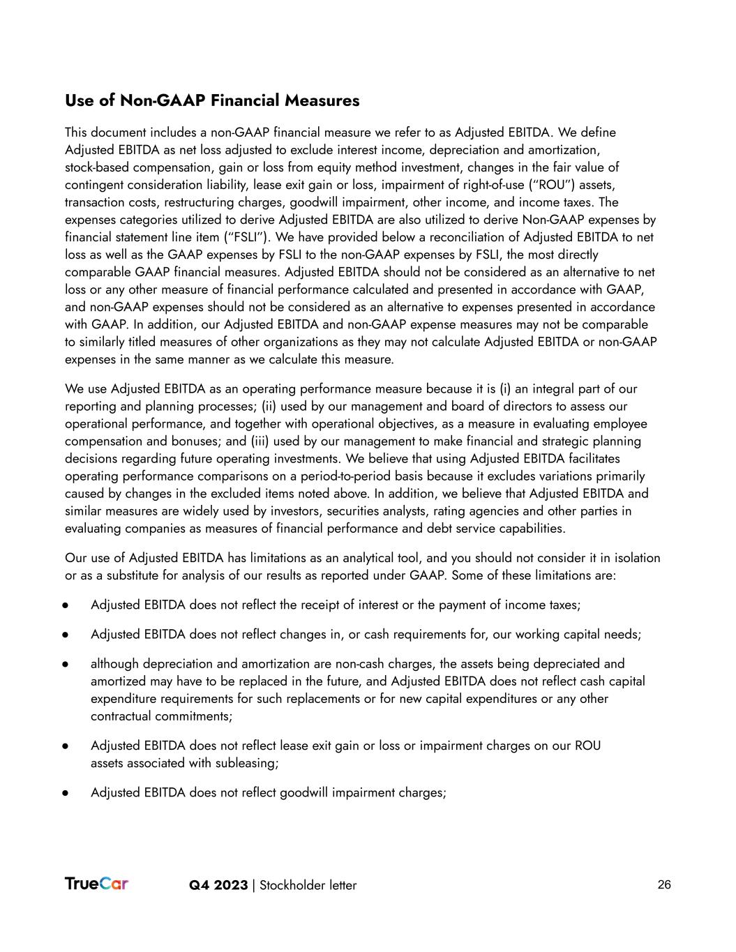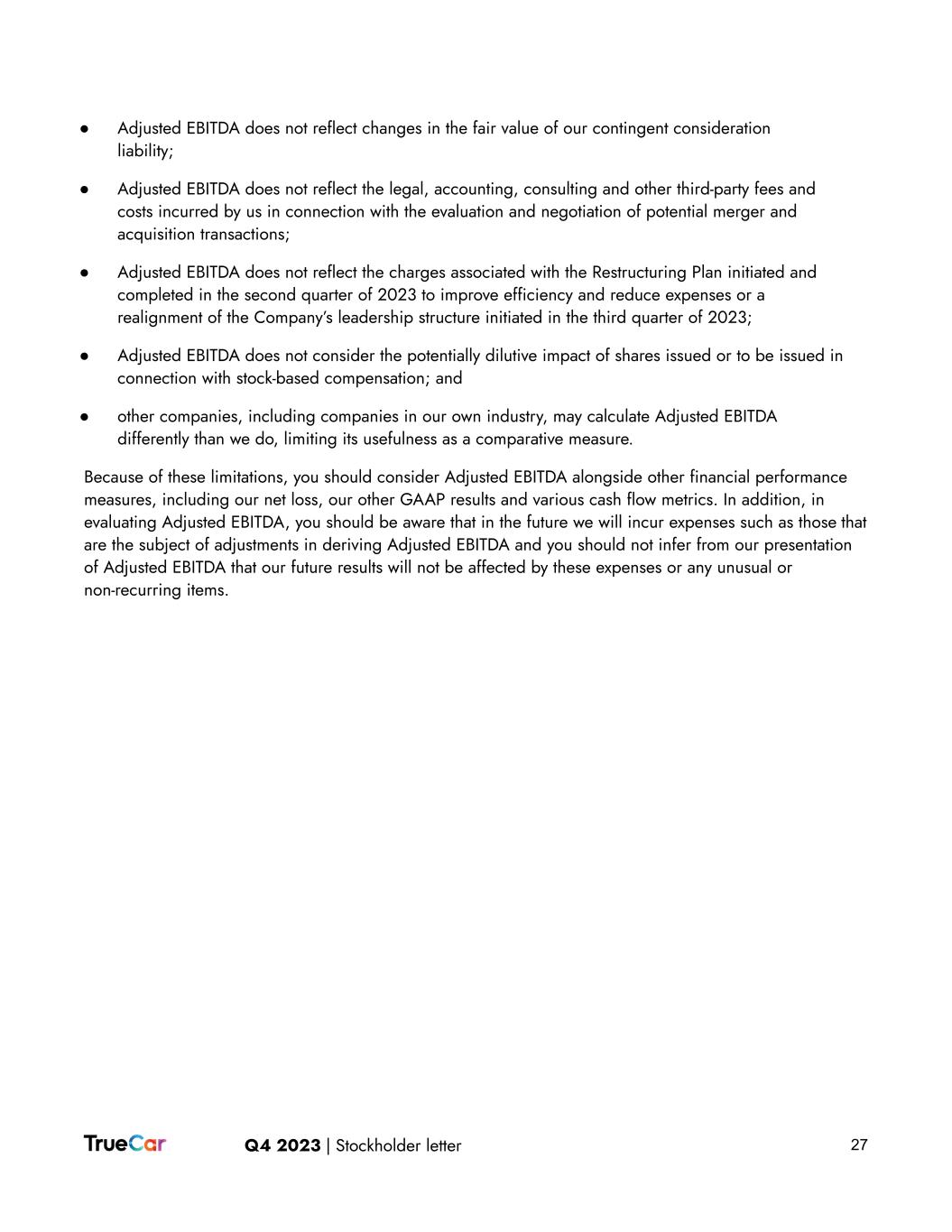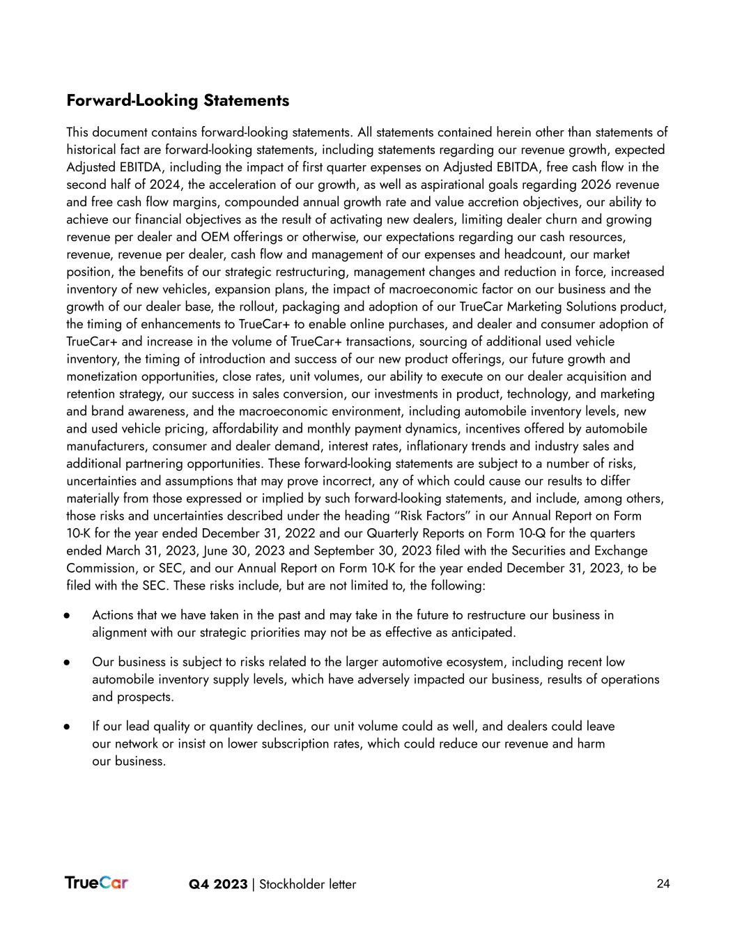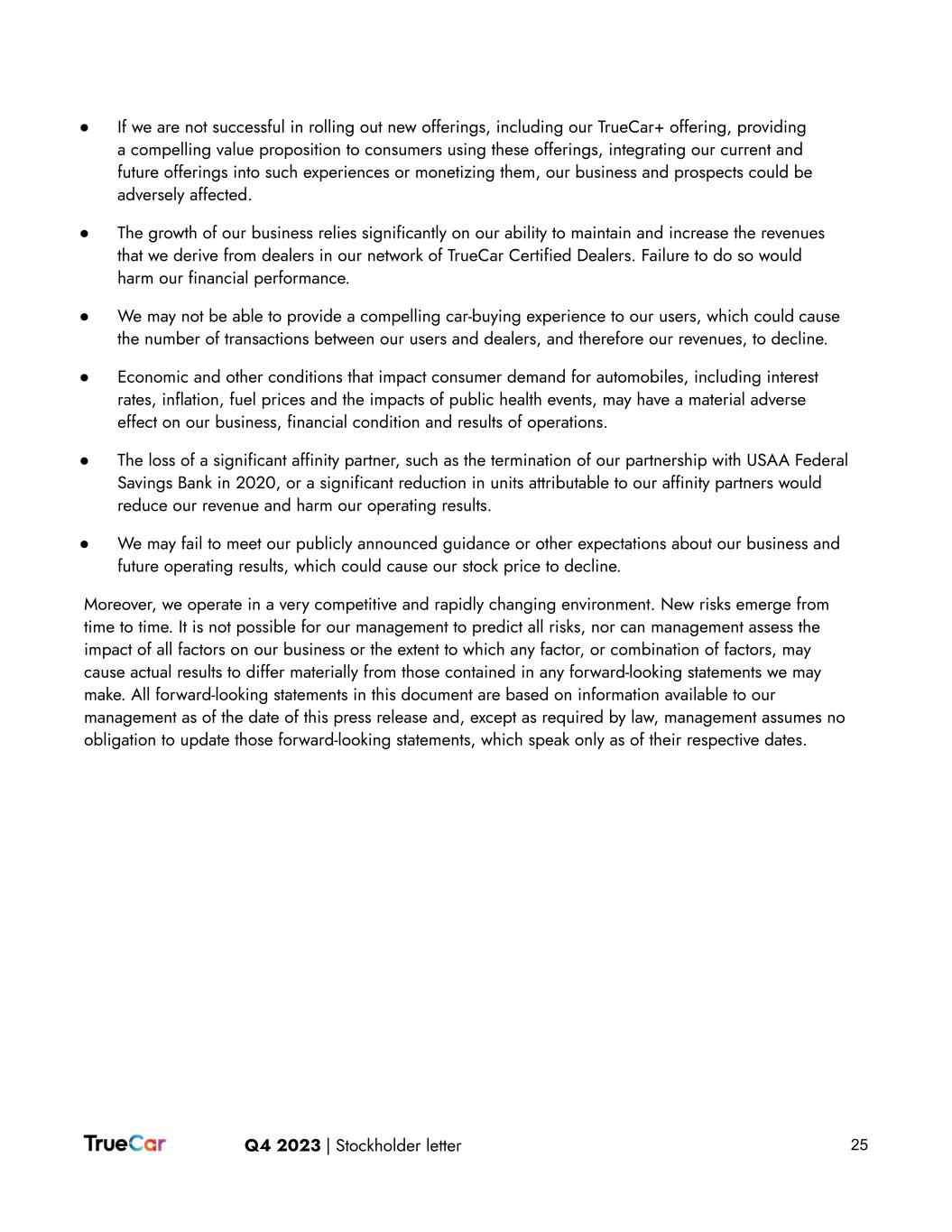 Q4 2023 | Stockholder letter 25 ● If we are not successful in rolling out new offerings, including our TrueCar+ offering, providing a compelling value proposition to consumers using these offerings, integrating our current and future offerings into such experiences or monetizing them, our business and prospects could be adversely affected. ● The growth of our business relies significantly on our ability to maintain and increase the revenues that we derive from dealers in our network of TrueCar Certified Dealers. Failure to do so would harm our financial performance. ● We may not be able to provide a compelling car-buying experience to our users, which could cause the number of transactions between our users and dealers, and therefore our revenues, to decline. ● Economic and other conditions that impact consumer demand for automobiles, including interest rates, inflation, fuel prices and the impacts of public health events, may have a material adverse effect on our business, financial condition and results of operations. ● The loss of a significant affinity partner, such as the termination of our partnership with USAA Federal Savings Bank in 2020, or a significant reduction in units attributable to our affinity partners would reduce our revenue and harm our operating results. ● We may fail to meet our publicly announced guidance or other expectations about our business and future operating results, which could cause our stock price to decline. Moreover, we operate in a very competitive and rapidly changing environment. New risks emerge from time to time. It is not possible for our management to predict all risks, nor can management assess the impact of all factors on our business or the extent to which any factor, or combination of factors, may cause actual results to differ materially from those contained in any forward-looking statements we may make. All forward-looking statements in this document are based on information available to our management as of the date of this press release and, except as required by law, management assumes no obligation to update those forward-looking statements, which speak only as of their respective dates.