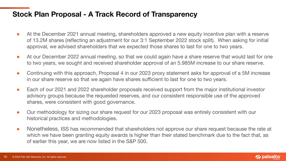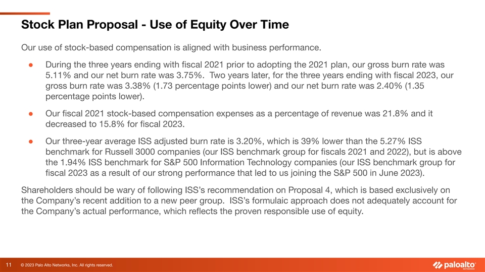 Stock Plan Proposal - A Track Record of Transparency ● At the December 2021 annual meeting, shareholders approved a new equity incentive plan with a reserve of 13.2M shares (reflecting an adjustment for our 3:1 September 2022 stock split). When asking for initial approval, we advised shareholders that we expected those shares to last for one to two years. ● At our December 2022 annual meeting, so that we could again have a share reserve that would last for one to two years, we sought and received shareholder approval of an 5.985M increase to our share reserve. ● Continuing with this approach, Proposal 4 in our 2023 proxy statement asks for approval of a 5M increase in our share reserve so that we again have shares sufficient to last for one to two years. ● Each of our 2021 and 2022 shareholder proposals received support from the major institutional investor advisory groups because the requested reserves, and our consistent responsible use of the approved shares, were consistent with good governance. ● Our methodology for sizing our share request for our 2023 proposal was entirely consistent with our historical practices and methodologies. ● Nonetheless, ISS has recommended that shareholders not approve our share request because the rate at which we have been granting equity awards is higher than their stated benchmark due to the fact that, as of earlier this year, we are now listed in the S&P 500. 10 © 2023 Palo Alto Networks, Inc. All rights reserved.