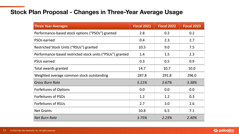 Stock Plan Proposal - Use of Equity Over Time Our use of stock-based compensation is aligned with business performance. ● During the three years ending with fiscal 2021 prior to adopting the 2021 plan, our gross burn rate was 5.11% and our net burn rate was 3.75%. Two years later, for the three years ending with fiscal 2023, our gross burn rate was 3.38% (1.73 percentage points lower) and our net burn rate was 2.40% (1.35 percentage points lower). ● Our fiscal 2021 stock-based compensation expenses as a percentage of revenue was 21.8% and it decreased to 15.8% for fiscal 2023. ● Our three-year average ISS adjusted burn rate is 3.20%, which is 39% lower than the 5.27% ISS benchmark for Russell 3000 companies (our ISS benchmark group for fiscals 2021 and 2022), but is above the 1.94% ISS benchmark for S&P 500 Information Technology companies (our ISS benchmark group for fiscal 2023 as a result of our strong performance that led to us joining the S&P 500 in June 2023). Shareholders should be wary of following ISS’s recommendation on Proposal 4, which is based exclusively on the Company’s recent addition to a new peer group. ISS’s formulaic approach does not adequately account for the Company’s actual performance, which reflects the proven responsible use of equity. 11 © 2023 Palo Alto Networks, Inc. All rights reserved.