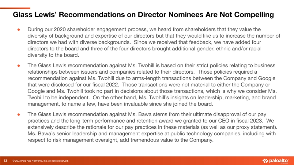 Glass Lewis’ Recommendations on Director Nominees Are Not Compelling ● During our 2020 shareholder engagement process, we heard from shareholders that they value the diversity of background and expertise of our directors but that they would like us to increase the number of directors we had with diverse backgrounds. Since we received that feedback, we have added four directors to the board and three of the four directors brought additional gender, ethnic and/or racial diversity to the board. ● The Glass Lewis recommendation against Ms. Twohill is based on their strict policies relating to business relationships between issuers and companies related to their directors. Those policies required a recommendation against Ms. Twohill due to arms-length transactions between the Company and Google that were disclosed for our fiscal 2022. Those transactions were not material to either the Company or Google and Ms. Twohill took no part in decisions about those transactions, which is why we consider Ms. Twohill to be independent. On the other hand, Ms. Twohill’s insights on leadership, marketing, and brand management, to name a few, have been invaluable since she joined the board. ● The Glass Lewis recommendation against Ms. Bawa stems from their ultimate disapproval of our pay practices and the long-term performance and retention award we granted to our CEO in fiscal 2023. We extensively describe the rationale for our pay practices in these materials (as well as our proxy statement). Ms. Bawa’s senior leadership and management expertise at public technology companies, including with respect to risk management oversight, add tremendous value to the Company. 13 © 2023 Palo Alto Networks, Inc. All rights reserved.