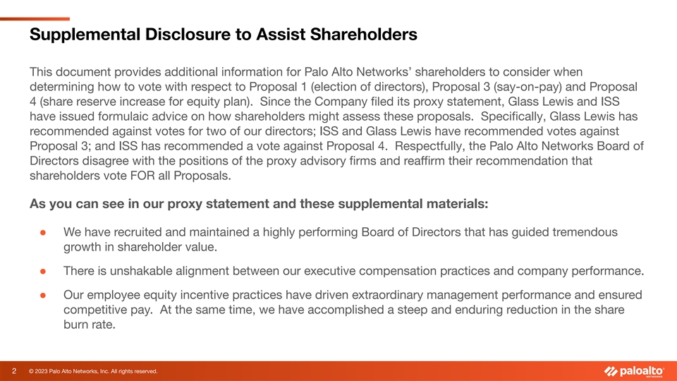 Supplemental Disclosure to Assist Shareholders This document provides additional information for Palo Alto Networks’ shareholders to consider when determining how to vote with respect to Proposal 1 (election of directors), Proposal 3 (say-on-pay) and Proposal 4 (share reserve increase for equity plan). Since the Company filed its proxy statement, Glass Lewis and ISS have issued formulaic advice on how shareholders might assess these proposals. Specifically, Glass Lewis has recommended against votes for two of our directors; ISS and Glass Lewis have recommended votes against Proposal 3; and ISS has recommended a vote against Proposal 4. Respectfully, the Palo Alto Networks Board of Directors disagree with the positions of the proxy advisory firms and reaffirm their recommendation that shareholders vote FOR all Proposals. As you can see in our proxy statement and these supplemental materials: ● We have recruited and maintained a highly performing Board of Directors that has guided tremendous growth in shareholder value. ● There is unshakable alignment between our executive compensation practices and company performance. ● Our employee equity incentive practices have driven extraordinary management performance and ensured competitive pay. At the same time, we have accomplished a steep and enduring reduction in the share burn rate. 2 © 2023 Palo Alto Networks, Inc. All rights reserved.
