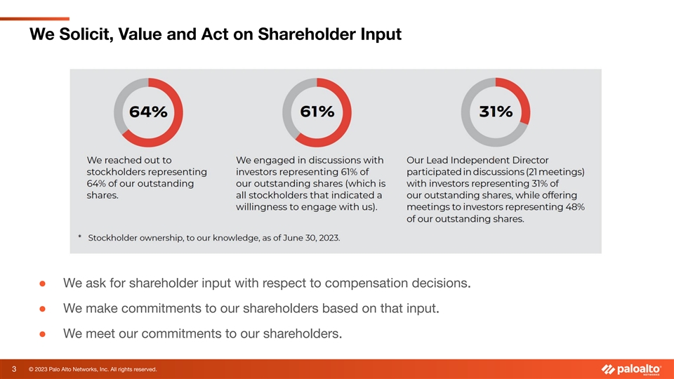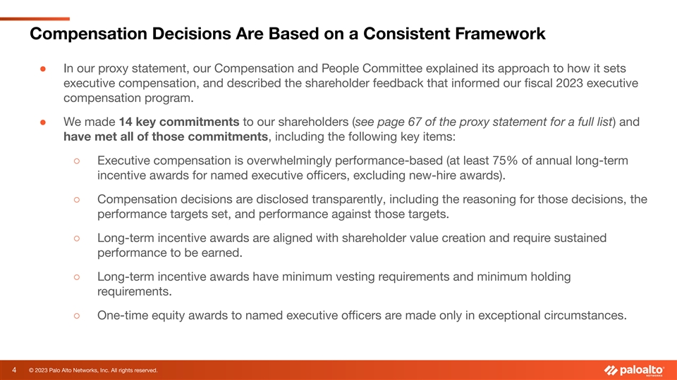 We Solicit, Value and Act on Shareholder Input ● We ask for shareholder input with respect to compensation decisions. ● We make commitments to our shareholders based on that input. ● We meet our commitments to our shareholders. 3 © 2023 Palo Alto Networks, Inc. All rights reserved.
