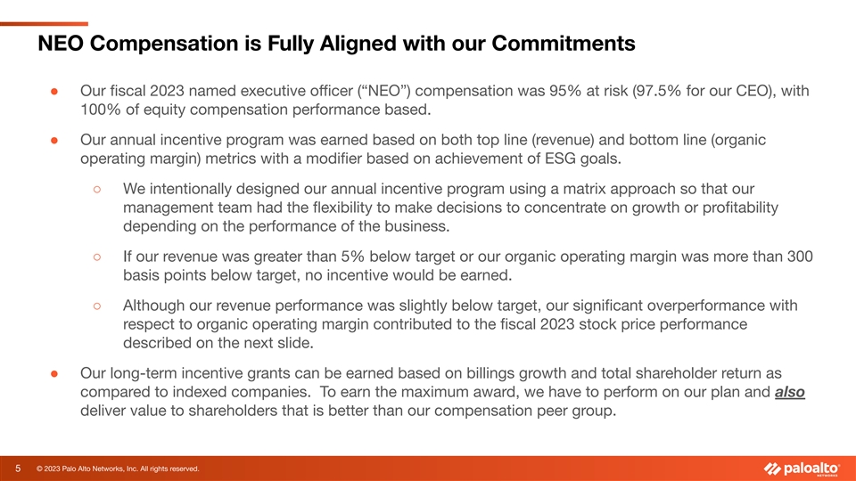Compensation Decisions Are Based on a Consistent Framework ● In our proxy statement, our Compensation and People Committee explained its approach to how it sets executive compensation, and described the shareholder feedback that informed our fiscal 2023 executive compensation program. ● We made 14 key commitments to our shareholders (see page 67 of the proxy statement for a full list) and have met all of those commitments, including the following key items: ○ Executive compensation is overwhelmingly performance-based (at least 75% of annual long-term incentive awards for named executive officers, excluding new-hire awards). ○ Compensation decisions are disclosed transparently, including the reasoning for those decisions, the performance targets set, and performance against those targets. ○ Long-term incentive awards are aligned with shareholder value creation and require sustained performance to be earned. ○ Long-term incentive awards have minimum vesting requirements and minimum holding requirements. ○ One-time equity awards to named executive officers are made only in exceptional circumstances. 4 © 2023 Palo Alto Networks, Inc. All rights reserved.