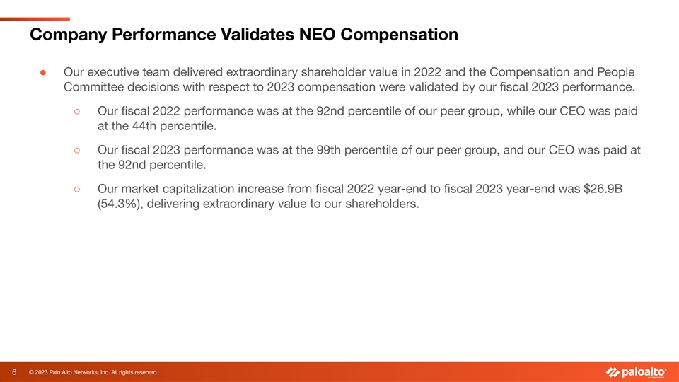 NEO Compensation is Fully Aligned with our Commitments ● Our fiscal 2023 named executive officer (“NEO”) compensation was 95% at risk (97.5% for our CEO), with 100% of equity compensation performance based. ● Our annual incentive program was earned based on both top line (revenue) and bottom line (organic operating margin) metrics with a modifier based on achievement of ESG goals. ○ We intentionally designed our annual incentive program using a matrix approach so that our management team had the flexibility to make decisions to concentrate on growth or profitability depending on the performance of the business. ○ If our revenue was greater than 5% below target or our organic operating margin was more than 300 basis points below target, no incentive would be earned. ○ Although our revenue performance was slightly below target, our significant overperformance with respect to organic operating margin contributed to the fiscal 2023 stock price performance described on the next slide. ● Our long-term incentive grants can be earned based on billings growth and total shareholder return as compared to indexed companies. To earn the maximum award, we have to perform on our plan and also deliver value to shareholders that is better than our compensation peer group. 5 © 2023 Palo Alto Networks, Inc. All rights reserved.