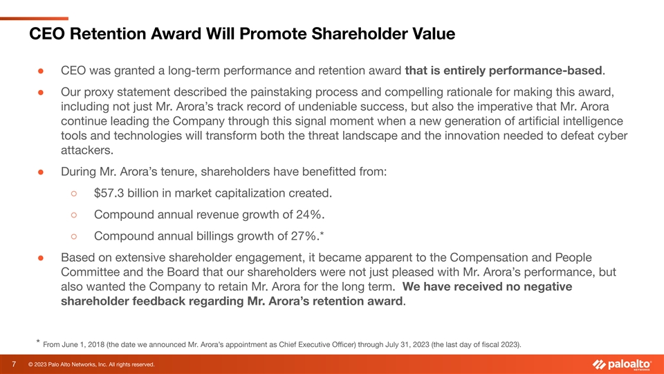 Company Performance Validates NEO Compensation ● Our executive team delivered extraordinary shareholder value in 2022 and the Compensation and People Committee decisions with respect to 2023 compensation were validated by our fiscal 2023 performance. ○ Our fiscal 2022 performance was at the 92nd percentile of our peer group, while our CEO was paid at the 44th percentile. ○ Our fiscal 2023 performance was at the 99th percentile of our peer group, and our CEO was paid at the 92nd percentile. ○ Our market capitalization increase from fiscal 2022 year-end to fiscal 2023 year-end was $26.9B (54.3%), delivering extraordinary value to our shareholders. 6 © 2023 Palo Alto Networks, Inc. All rights reserved.