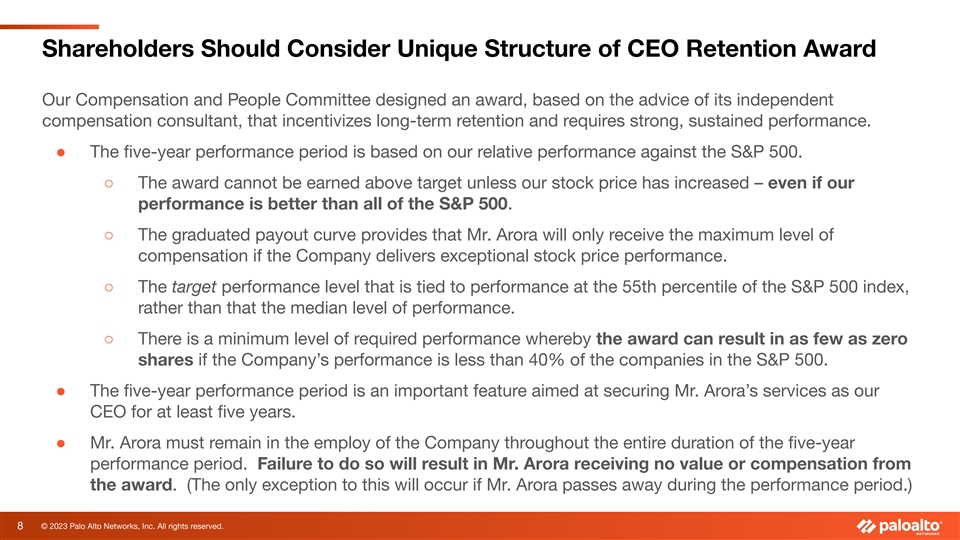 CEO Retention Award Will Promote Shareholder Value ● CEO was granted a long-term performance and retention award that is entirely performance-based. ● Our proxy statement described the painstaking process and compelling rationale for making this award, including not just Mr. Arora’s track record of undeniable success, but also the imperative that Mr. Arora continue leading the Company through this signal moment when a new generation of artificial intelligence tools and technologies will transform both the threat landscape and the innovation needed to defeat cyber attackers. ● During Mr. Arora’s tenure, shareholders have benefitted from: ○ $57.3 billion in market capitalization created. ○ Compound annual revenue growth of 24%. ○ Compound annual billings growth of 27%.* ● Based on extensive shareholder engagement, it became apparent to the Compensation and People Committee and the Board that our shareholders were not just pleased with Mr. Arora’s performance, but also wanted the Company to retain Mr. Arora for the long term. We have received no negative shareholder feedback regarding Mr. Arora’s retention award. * From June 1, 2018 (the date we announced Mr. Arora’s appointment as Chief Executive Officer) through July 31, 2023 (the last day of fiscal 2023). 7 © 2023 Palo Alto Networks, Inc. All rights reserved.