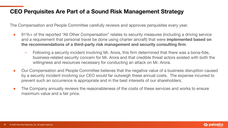 Shareholders Should Consider Unique Structure of CEO Retention Award Our Compensation and People Committee designed an award, based on the advice of its independent compensation consultant, that incentivizes long-term retention and requires strong, sustained performance. ● The five-year performance period is based on our relative performance against the S&P 500. ○ The award cannot be earned above target unless our stock price has increased – even if our performance is better than all of the S&P 500. ○ The graduated payout curve provides that Mr. Arora will only receive the maximum level of compensation if the Company delivers exceptional stock price performance. ○ The target performance level that is tied to performance at the 55th percentile of the S&P 500 index, rather than that the median level of performance. ○ There is a minimum level of required performance whereby the award can result in as few as zero shares if the Company’s performance is less than 40% of the companies in the S&P 500. ● The five-year performance period is an important feature aimed at securing Mr. Arora’s services as our CEO for at least five years. ● Mr. Arora must remain in the employ of the Company throughout the entire duration of the five-year performance period. Failure to do so will result in Mr. Arora receiving no value or compensation from the award. (The only exception to this will occur if Mr. Arora passes away during the performance period.) 8 © 2023 Palo Alto Networks, Inc. All rights reserved.