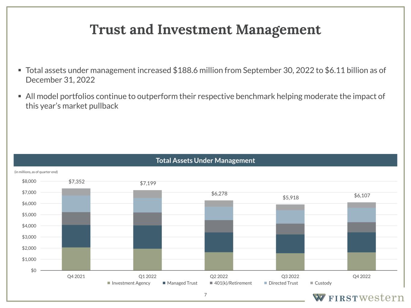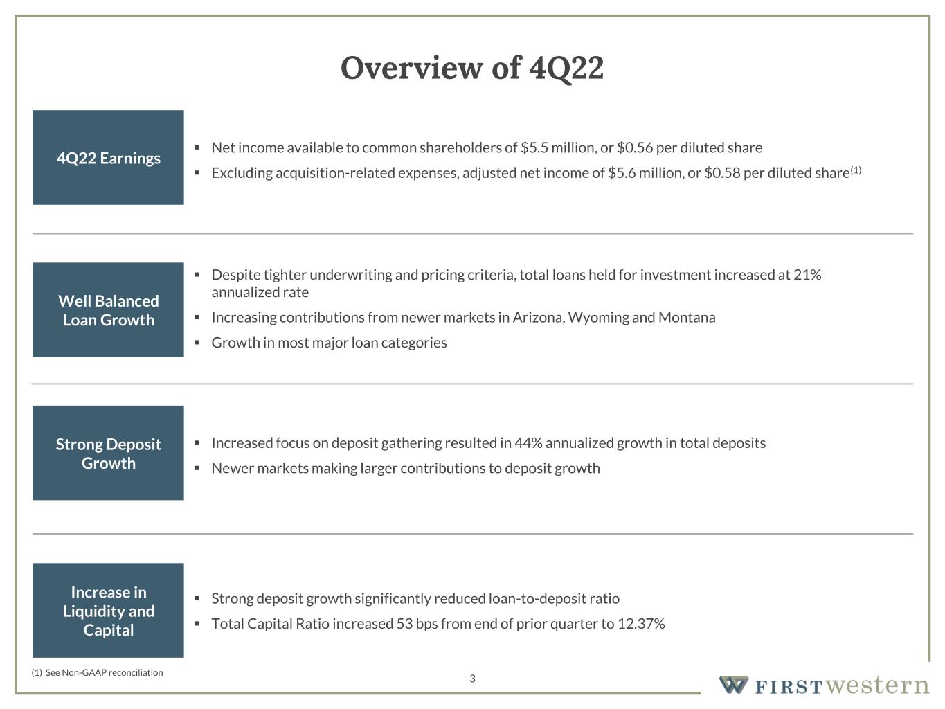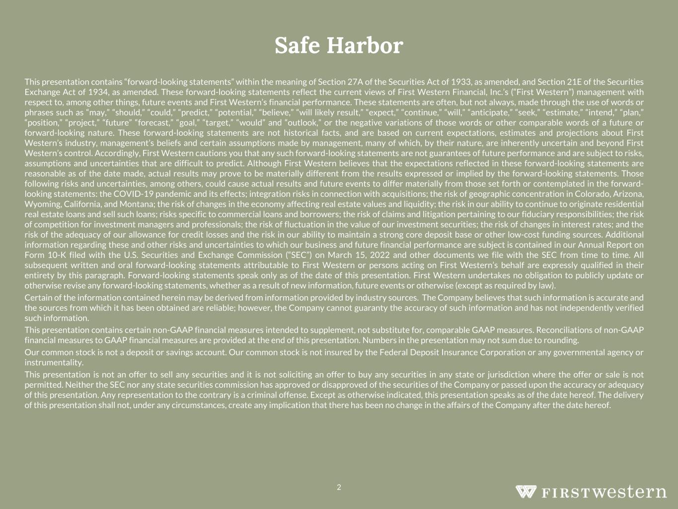 Safe Harbor 2 This presentation contains “forward-looking statements” within the meaning of Section 27A of the Securities Act of 1933, as amended, and Section 21E of the Securities Exchange Act of 1934, as amended. These forward-looking statements reflect the current views of First Western Financial, Inc.’s (“First Western”) management with respect to, among other things, future events and First Western’s financial performance. These statements are often, but not always, made through the use of words or phrases such as “may,” “should,” “could,” “predict,” “potential,” “believe,” “will likely result,” “expect,” “continue,” “will,” “anticipate,” “seek,” “estimate,” “intend,” “plan,” “position,” “project,” “future” “forecast,” “goal,” “target,” “would” and “outlook,” or the negative variations of those words or other comparable words of a future or forward-looking nature. These forward-looking statements are not historical facts, and are based on current expectations, estimates and projections about First Western’s industry, management’s beliefs and certain assumptions made by management, many of which, by their nature, are inherently uncertain and beyond First Western’s control. Accordingly, First Western cautions you that any such forward-looking statements are not guarantees of future performance and are subject to risks, assumptions and uncertainties that are difficult to predict. Although First Western believes that the expectations reflected in these forward-looking statements are reasonable as of the date made, actual results may prove to be materially different from the results expressed or implied by the forward-looking statements. Those following risks and uncertainties, among others, could cause actual results and future events to differ materially from those set forth or contemplated in the forward- looking statements: the COVID-19 pandemic and its effects; integration risks in connection with acquisitions; the risk of geographic concentration in Colorado, Arizona, Wyoming, California, and Montana; the risk of changes in the economy affecting real estate values and liquidity; the risk in our ability to continue to originate residential real estate loans and sell such loans; risks specific to commercial loans and borrowers; the risk of claims and litigation pertaining to our fiduciary responsibilities; the risk of competition for investment managers and professionals; the risk of fluctuation in the value of our investment securities; the risk of changes in interest rates; and the risk of the adequacy of our allowance for credit losses and the risk in our ability to maintain a strong core deposit base or other low-cost funding sources. Additional information regarding these and other risks and uncertainties to which our business and future financial performance are subject is contained in our Annual Report on Form 10-K filed with the U.S. Securities and Exchange Commission (“SEC”) on March 15, 2022 and other documents we file with the SEC from time to time. All subsequent written and oral forward-looking statements attributable to First Western or persons acting on First Western’s behalf are expressly qualified in their entirety by this paragraph. Forward-looking statements speak only as of the date of this presentation. First Western undertakes no obligation to publicly update or otherwise revise any forward-looking statements, whether as a result of new information, future events or otherwise (except as required by law). Certain of the information contained herein may be derived from information provided by industry sources. The Company believes that such information is accurate and the sources from which it has been obtained are reliable; however, the Company cannot guaranty the accuracy of such information and has not independently verified such information. This presentation contains certain non-GAAP financial measures intended to supplement, not substitute for, comparable GAAP measures. Reconciliations of non-GAAP financial measures to GAAP financial measures are provided at the end of this presentation. Numbers in the presentation may not sum due to rounding. Our common stock is not a deposit or savings account. Our common stock is not insured by the Federal Deposit Insurance Corporation or any governmental agency or instrumentality. This presentation is not an offer to sell any securities and it is not soliciting an offer to buy any securities in any state or jurisdiction where the offer or sale is not permitted. Neither the SEC nor any state securities commission has approved or disapproved of the securities of the Company or passed upon the accuracy or adequacy of this presentation. Any representation to the contrary is a criminal offense. Except as otherwise indicated, this presentation speaks as of the date hereof. The delivery of this presentation shall not, under any circumstances, create any implication that there has been no change in the affairs of the Company after the date hereof.