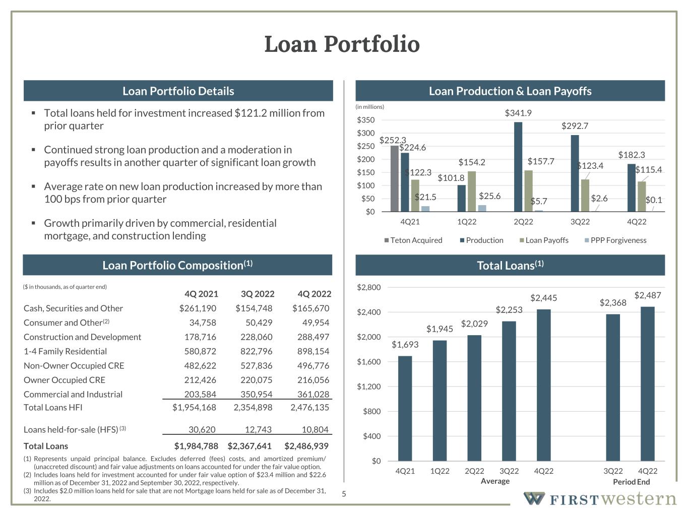4 Net Income Available to Common Shareholders and Earnings per Share ▪ Net income of $5.5 million, or $0.56 diluted earnings per share, in 4Q22 ▪ Excluding acquisition-related expenses, adjusted diluted earnings per share(1) of $0.58 in 4Q22 ▪ Strong profitability resulted in 2.5% and 3.0% increase in book value per share and tangible book value per share(1), respectively, from 3Q22 ▪ Consistent value creation resulted in both book value and tangible book value per share(1) increasing by more than 9% during 2022 $1,917 $5,524 $4,482 $6,221 $5,471 $4,776 $5,922 $4,742 $6,337 $5,617 $0 $1,000 $2,000 $3,000 $4,000 $5,000 $6,000 $7,000 Q4 2021 Q1 2022 Q2 2022 Q3 2022 Q4 2022 Net Income Adjustments to Net Income $0.23 $0.57 $0.46 $0.64 $0.56 $0.57 $0.61 $0.49 $0.66 $0.58 $0.00 $0.10 $0.20 $0.30 $0.40 $0.50 $0.60 $0.70 $0.80 Q4 2021 Q1 2022 Q2 2022 Q3 2022 Q4 2022 Net Income Adjustments to Net Income Net Income Available to Common Shareholders Diluted Earnings per Share (1) See Non-GAAP reconciliation (1) (1) (1) (1)(1) (1) (1) (1) (1) (1)
