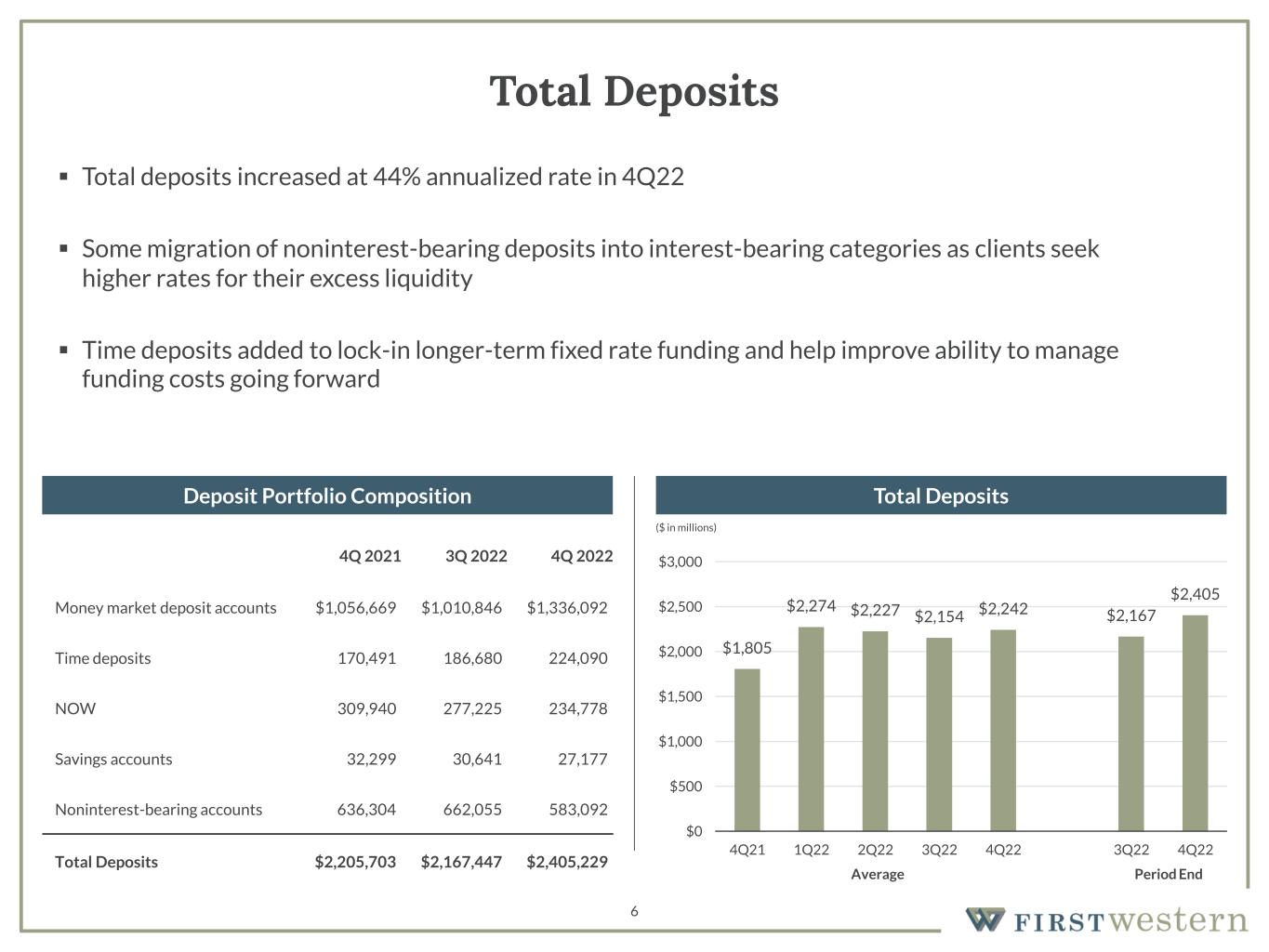 5 Loan Portfolio ▪ Total loans held for investment increased $121.2 million from prior quarter ▪ Continued strong loan production and a moderation in payoffs results in another quarter of significant loan growth ▪ Average rate on new loan production increased by more than 100 bps from prior quarter ▪ Growth primarily driven by commercial, residential mortgage, and construction lending 4Q 2021 3Q 2022 4Q 2022 Cash, Securities and Other $261,190 $154,748 $165,670 Consumer and Other(2) 34,758 50,429 49,954 Construction and Development 178,716 228,060 288,497 1-4 Family Residential 580,872 822,796 898,154 Non-Owner Occupied CRE 482,622 527,836 496,776 Owner Occupied CRE 212,426 220,075 216,056 Commercial and Industrial 203,584 350,954 361,028 Total Loans HFI $1,954,168 2,354,898 2,476,135 Loans held-for-sale (HFS) (3) 30,620 12,743 10,804 Total Loans $1,984,788 $2,367,641 $2,486,939 $252.3 $224.6 $101.8 $341.9 $292.7 $182.3 $122.3 $154.2 $157.7 $123.4 $115.4 $21.5 $25.6 $5.7 $2.6 $0.1 $0 $50 $100 $150 $200 $250 $300 $350 4Q21 1Q22 2Q22 3Q22 4Q22 Teton Acquired Production Loan Payoffs PPP Forgiveness (in millions) $1,693 $1,945 $2,029 $2,253 $2,445 $2,368 $2,487 $0 $400 $800 $1,200 $1,600 $2,000 $2,400 $2,800 4Q21 1Q22 2Q22 3Q22 4Q22 3Q22 4Q22 (1) Represents unpaid principal balance. Excludes deferred (fees) costs, and amortized premium/ (unaccreted discount) and fair value adjustments on loans accounted for under the fair value option. (2) Includes loans held for investment accounted for under fair value option of $23.4 million and $22.6 million as of December 31, 2022 and September 30, 2022, respectively. (3) Includes $2.0 million loans held for sale that are not Mortgage loans held for sale as of December 31, 2022. ($ in thousands, as of quarter end) Loan Portfolio Composition(1) Loan Portfolio Details Loan Production & Loan Payoffs Total Loans(1) Average Period End