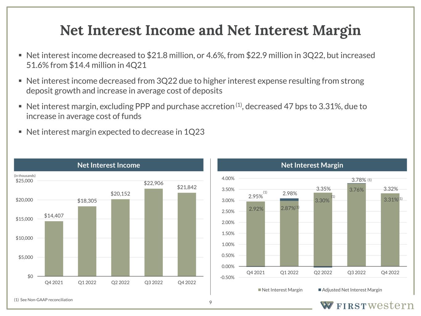 (1) See Non-GAAP reconciliation Gross Revenue ▪ Gross revenue(1) relatively consistent with prior quarter ▪ Higher non-interest income partially offset decline in net interest income ▪ Consistent growth in balance sheet and client base resulted in 4Q22 gross revenue(1) increasing 23.8% from same quarter in 2021, despite mortgage revenues declining Non-interest Income $6,561 Net Interest Income $21,842 23.9% 76.1% $23.4 $26.9 $26.9 $29.3 $29.0 $0.0 $5.0 $10.0 $15.0 $20.0 $25.0 $30.0 $35.0 Q4 2021 Q1 2022 Q2 2022 Q3 2022 Q4 2022 Wealth Management Mortgage (in millions) 4Q22 Gross Revenue(1) Gross Revenue(1) 8