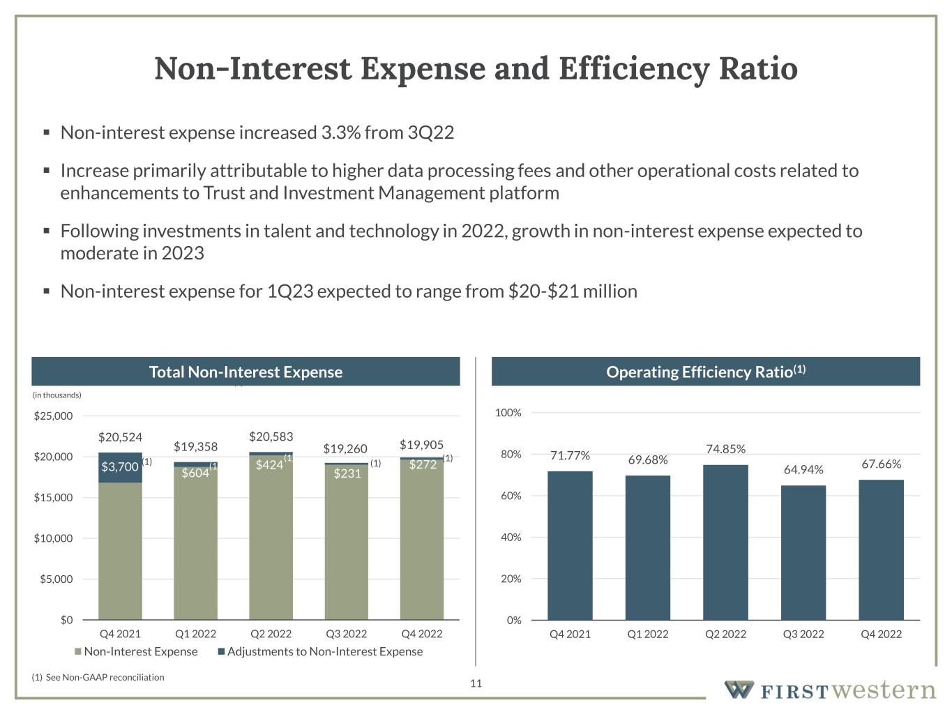 10 Non-Interest Income ▪ Non-interest income increased 3.4% from 3Q22, primarily due to increases in bank fees and risk management and insurance fees ▪ Increase in risk management and insurance fees reflect typical seasonal increase in fourth quarter, while increase in bank fees partially driven by higher loan prepayment penalty fees ▪ Trust and Investment Management fees and net gain on mortgage loans beginning to stabilize ▪ Volume of locks on mortgage loans originated for sale declined 32% from the prior quarter, with 95% of the originations being purchase loans $9,516 $8,579 $6,926 $6,345 $6,561 $0 $2,000 $4,000 $6,000 $8,000 $10,000 $12,000 Q4 2021 Q1 2022 Q2 2022 Q3 2022 Q4 2022 Trust and Investment Management Fees Net Gain on Mortgage Loans Bank Fees Risk Management and Insurance Fees Income on Company-Owned Life Insurance Other $5,197 $5,168 $4,784 $4,664 $4,358 $4,000 $4,200 $4,400 $4,600 $4,800 $5,000 $5,200 $5,400 Q4 2021 Q1 2022 Q2 2022 Q3 2022 Q4 2022 (in thousands)(in thousands) Total Non-Interest Income Trust and Investment Management Fees