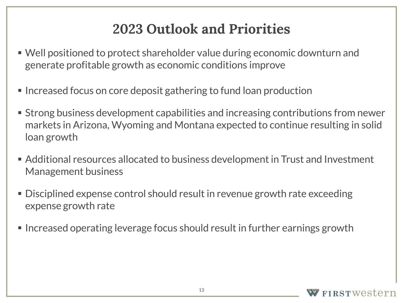 13 2023 Outlook and Priorities ▪ Well positioned to protect shareholder value during economic downturn and generate profitable growth as economic conditions improve ▪ Increased focus on core deposit gathering to fund loan production ▪ Strong business development capabilities and increasing contributions from newer markets in Arizona, Wyoming and Montana expected to continue resulting in solid loan growth ▪ Additional resources allocated to business development in Trust and Investment Management business ▪ Disciplined expense control should result in revenue growth rate exceeding expense growth rate ▪ Increased operating leverage focus should result in further earnings growth