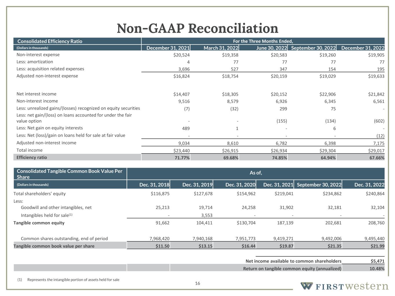 15 Capital and Liquidity Overview 9.28% 9.28% 12.37% 7.81% 0.00% 2.00% 4.00% 6.00% 8.00% 10.00% 12.00% 14.00% Tier 1 Capital to Risk-Weighted Assets CET1 to Risk- Weighted Assets Total Capital to Risk-Weighted Assets Tier 1 Capital to Average Assets Liquidity Funding Sources (as of 12/31/22) Liquidity Reserves: Total Available Cash $ 194,871 Unpledged Investment Securities 58,498 Borrowed Funds: Unsecured: Credit Lines 29,000 Secured: FHLB Available 751,224 Brokered Remaining Capacity 445,175 Total Liquidity Funding Sources $ 1,479,112 Loan to Deposit Ratio 102.7% $91,662 $104,411 $130,704 $187,139 $208,760 $11.50 $13.15 $16.44 $19.87 $21.99 $10.00 $15.00 $20.00 $25.00 $30.00 $40,000 $60,000 $80,000 $100,000 $120,000 $140,000 $160,000 $180,000 $200,000 $220,000 $240,000 4Q18 4Q19 4Q20 4Q21 4Q22 TCE TBV/Share (in thousands) (1) See Non-GAAP reconciliation Consolidated Capital Ratios (as of 12/31/22) Tangible Common Equity / TBV per Share(1) (in thousands)