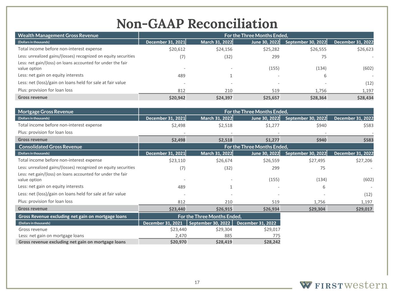 17 Non-GAAP Reconciliation Wealth Management Gross Revenue For the Three Months Ended, (Dollars in thousands) December 31, 2021 March 31, 2022 June 30, 2022 September 30, 2022 December 31, 2022 Total income before non-interest expense $20,612 $24,156 $25,282 $26,555 $26,623 Less: unrealized gains/(losses) recognized on equity securities (7) (32) 299 75 - Less: net gain/(loss) on loans accounted for under the fair value option - - (155) (134) (602) Less: net gain on equity interests 489 1 - 6 - Less: net (loss)/gain on loans held for sale at fair value - - - - (12) Plus: provision for loan loss 812 210 519 1,756 1,197 Gross revenue $20,942 $24,397 $25,657 $28,364 $28,434 Mortgage Gross Revenue For the Three Months Ended, (Dollars in thousands) December 31, 2021 March 31, 2022 June 30, 2022 September 30, 2022 December 31, 2022 Total income before non-interest expense $2,498 $2,518 $1,277 $940 $583 Plus: provision for loan loss - - - - - Gross revenue $2,498 $2,518 $1,277 $940 $583 Consolidated Gross Revenue For the Three Months Ended, (Dollars in thousands) December 31, 2021 March 31, 2022 June 30, 2022 September 30, 2022 December 31, 2022 Total income before non-interest expense $23,110 $26,674 $26,559 $27,495 $27,206 Less: unrealized gains/(losses) recognized on equity securities (7) (32) 299 75 - Less: net gain/(loss) on loans accounted for under the fair value option - - (155) (134) (602) Less: net gain on equity interests 489 1 - 6 - Less: net (loss)/gain on loans held for sale at fair value - - - - (12) Plus: provision for loan loss 812 210 519 1,756 1,197 Gross revenue $23,440 $26,915 $26,934 $29,304 $29,017 Gross Revenue excluding net gain on mortgage loans For the Three Months Ended, (Dollars in thousands) December 31, 2021 September 30, 2022 December 31, 2022 Gross revenue $23,440 $29,304 $29,017 Less: net gain on mortgage loans 2,470 885 775 Gross revenue excluding net gain on mortgage loans $20,970 $28,419 $28,242