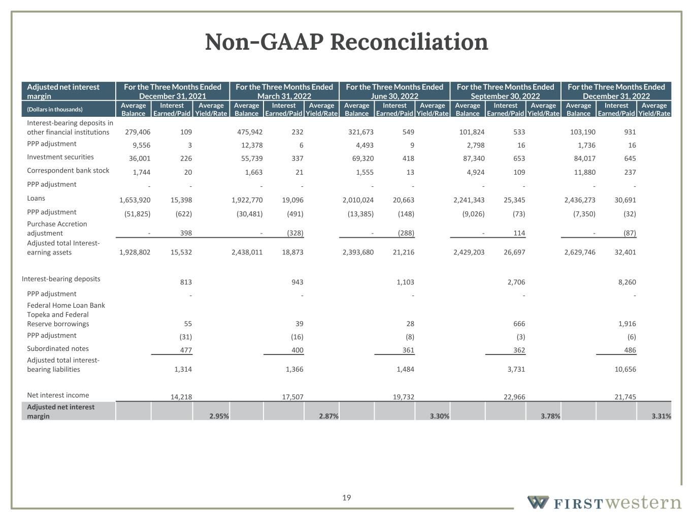 18 Non-GAAP Reconciliation Adjusted net income available to common shareholders For the Three Months Ended, (Dollars in thousands, except per share data) December 31, 2021 March 31, 2022 June 30, 2022 September 30, 2022 December 31, 2022 Net income available to common shareholders $1,917 $5,524 $4,482 $6,221 $5,471 Plus: acquisition related expense including tax impact 2,859 398 260 116 146 Adjusted net income to common shareholders $4,776 $5,922 $4,742 $6,337 $5,617 Adjusted diluted earnings per share For the Three Months Ended, (Dollars in thousands, except per share data) December 31, 2021 March 31, 2022 June 30, 2022 September 30, 2022 December 31, 2022 Diluted earnings per share $0.23 $0.57 $0.46 $0.64 $0.56 Plus: acquisition related expenses including tax impact 0.34 0.04 0.03 0.02 0.02 Adjusted diluted earnings per share $0.57 $0.61 $0.49 $0.66 $0.58 Allowance for loan losses to Bank originated loans excluding PPP As of (Dollars in thousands) December 31, 2021 March 31, 2022 June 30, 2022 September 30, 2022 December 31, 2022 Total loans held for investment $1,954,168 $1,931,122 $2,150,148 $2,354,898 $2,476,135 Less: Acquired loans 360,661 323,563 287,623 248,573 234,717 Less: PPP loans 40,062 13,109 9,053 6,905 6,378 Less: Purchased loans accounted for under fair value - 6.368 21,149 22,648 23,415 Loans excluding acquired and PPP 1,553,445 1,588,082 1,832,323 2,076,772 2,211,625 Allowance for loan losses 13,732 13,885 14,357 16,081 17,183 Allowance for loan losses to Bank originated loans excluding PPP 0.88% 0.87% 0.78% 0.77% 0.78% Pre-tax, pre-provision net income For the Three Months Ended, (Dollars in thousands) December 31, 2021 September 30, 2022 December 31, 2022 Income before income taxes $2,587 $8,235 $7,301 Plus: provision for loan losses 812 1,756 1,197 Pre-tax, pre-provision net income $3,399 $9,991 $8,498