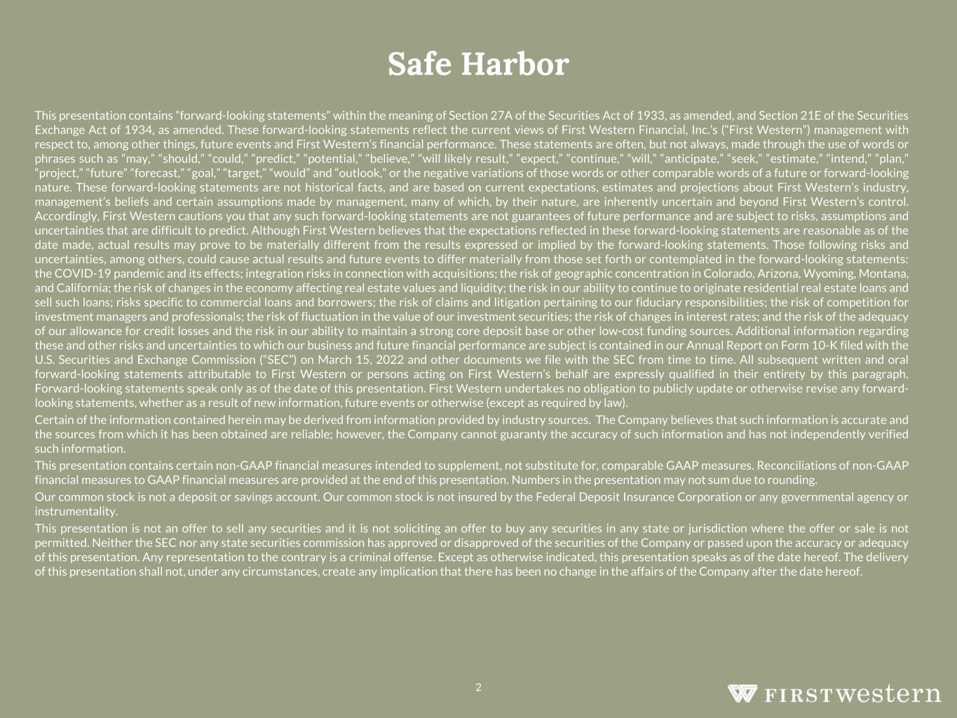 Safe Harbor 2 This presentation contains “forward-looking statements” within the meaning of Section 27A of the Securities Act of 1933, as amended, and Section 21E of the Securities Exchange Act of 1934, as amended. These forward-looking statements reflect the current views of First Western Financial, Inc.’s (“First Western”) management with respect to, among other things, future events and First Western’s financial performance. These statements are often, but not always, made through the use of words or phrases such as “may,” “should,” “could,” “predict,” “potential,” “believe,” “will likely result,” “expect,” “continue,” “will,” “anticipate,” “seek,” “estimate,” “intend,” “plan,” “project,” “future” “forecast,” “goal,” “target,” “would” and “outlook,” or the negative variations of those words or other comparable words of a future or forward-looking nature. These forward-looking statements are not historical facts, and are based on current expectations, estimates and projections about First Western’s industry, management’s beliefs and certain assumptions made by management, many of which, by their nature, are inherently uncertain and beyond First Western’s control. Accordingly, First Western cautions you that any such forward-looking statements are not guarantees of future performance and are subject to risks, assumptions and uncertainties that are difficult to predict. Although First Western believes that the expectations reflected in these forward-looking statements are reasonable as of the date made, actual results may prove to be materially different from the results expressed or implied by the forward-looking statements. Those following risks and uncertainties, among others, could cause actual results and future events to differ materially from those set forth or contemplated in the forward-looking statements: the COVID-19 pandemic and its effects; integration risks in connection with acquisitions; the risk of geographic concentration in Colorado, Arizona, Wyoming, Montana, and California; the risk of changes in the economy affecting real estate values and liquidity; the risk in our ability to continue to originate residential real estate loans and sell such loans; risks specific to commercial loans and borrowers; the risk of claims and litigation pertaining to our fiduciary responsibilities; the risk of competition for investment managers and professionals; the risk of fluctuation in the value of our investment securities; the risk of changes in interest rates; and the risk of the adequacy of our allowance for credit losses and the risk in our ability to maintain a strong core deposit base or other low-cost funding sources. Additional information regarding these and other risks and uncertainties to which our business and future financial performance are subject is contained in our Annual Report on Form 10-K filed with the U.S. Securities and Exchange Commission (“SEC”) on March 15, 2022 and other documents we file with the SEC from time to time. All subsequent written and oral forward-looking statements attributable to First Western or persons acting on First Western’s behalf are expressly qualified in their entirety by this paragraph. Forward-looking statements speak only as of the date of this presentation. First Western undertakes no obligation to publicly update or otherwise revise any forward- looking statements, whether as a result of new information, future events or otherwise (except as required by law). Certain of the information contained herein may be derived from information provided by industry sources. The Company believes that such information is accurate and the sources from which it has been obtained are reliable; however, the Company cannot guaranty the accuracy of such information and has not independently verified such information. This presentation contains certain non-GAAP financial measures intended to supplement, not substitute for, comparable GAAP measures. Reconciliations of non-GAAP financial measures to GAAP financial measures are provided at the end of this presentation. Numbers in the presentation may not sum due to rounding. Our common stock is not a deposit or savings account. Our common stock is not insured by the Federal Deposit Insurance Corporation or any governmental agency or instrumentality. This presentation is not an offer to sell any securities and it is not soliciting an offer to buy any securities in any state or jurisdiction where the offer or sale is not permitted. Neither the SEC nor any state securities commission has approved or disapproved of the securities of the Company or passed upon the accuracy or adequacy of this presentation. Any representation to the contrary is a criminal offense. Except as otherwise indicated, this presentation speaks as of the date hereof. The delivery of this presentation shall not, under any circumstances, create any implication that there has been no change in the affairs of the Company after the date hereof.