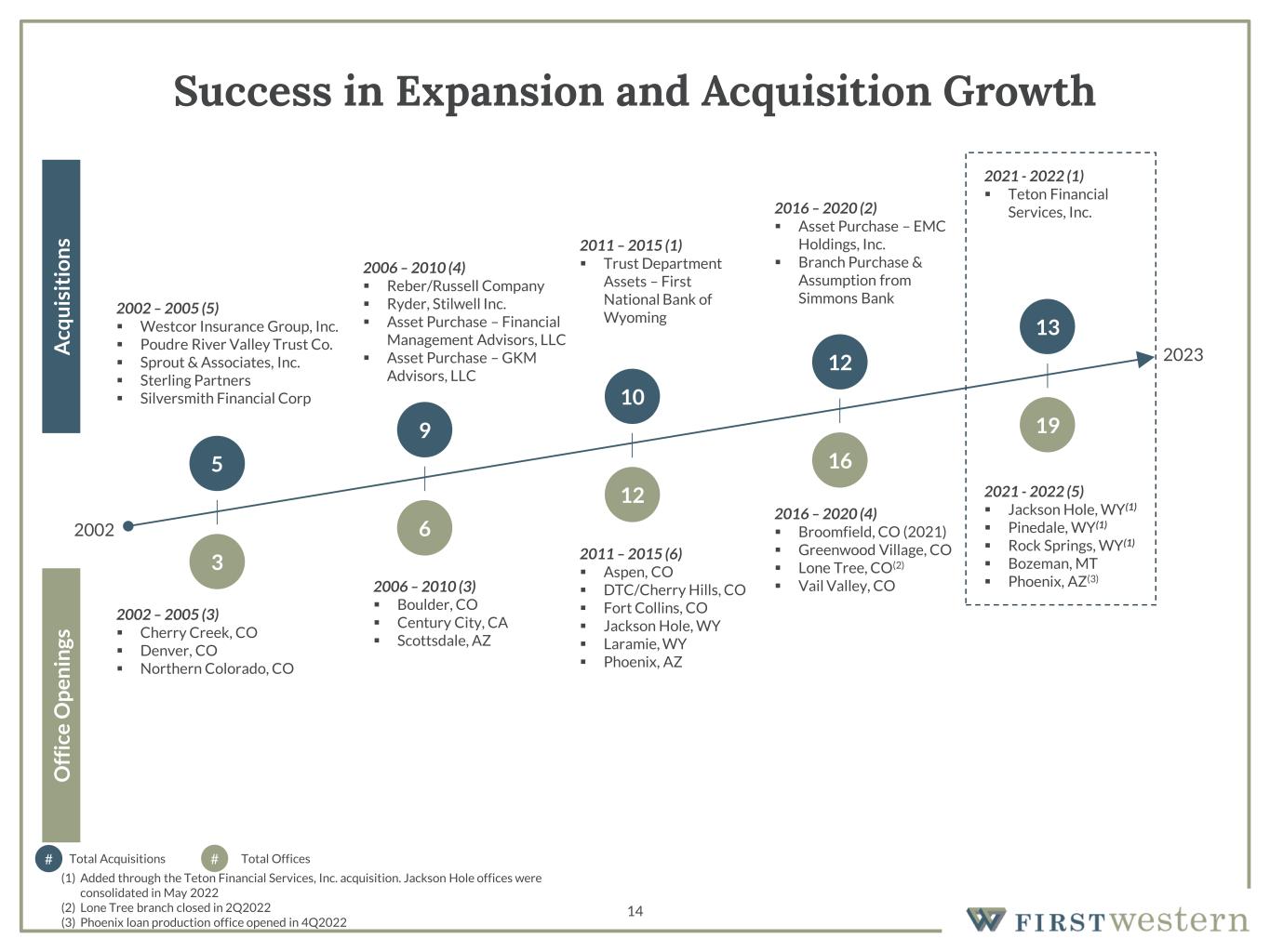 14 Success in Expansion and Acquisition Growth 2006 – 2010 (3) ▪ Boulder, CO ▪ Century City, CA ▪ Scottsdale, AZ 2011 – 2015 (6) ▪ Aspen, CO ▪ DTC/Cherry Hills, CO ▪ Fort Collins, CO ▪ Jackson Hole, WY ▪ Laramie, WY ▪ Phoenix, AZ 2016 – 2020 (4) ▪ Broomfield, CO (2021) ▪ Greenwood Village, CO ▪ Lone Tree, CO(2) ▪ Vail Valley, CO 2002 – 2005 (3) ▪ Cherry Creek, CO ▪ Denver, CO ▪ Northern Colorado, CO 2002 – 2005 (5) ▪ Westcor Insurance Group, Inc. ▪ Poudre River Valley Trust Co. ▪ Sprout & Associates, Inc. ▪ Sterling Partners ▪ Silversmith Financial Corp 2006 – 2010 (4) ▪ Reber/Russell Company ▪ Ryder, Stilwell Inc. ▪ Asset Purchase – Financial Management Advisors, LLC ▪ Asset Purchase – GKM Advisors, LLC 2011 – 2015 (1) ▪ Trust Department Assets – First National Bank of Wyoming 2016 – 2020 (2) ▪ Asset Purchase – EMC Holdings, Inc. ▪ Branch Purchase & Assumption from Simmons Bank O ff ic e O p e n in g s A cq u is it io n s 2002 2023 3 5 6 9 12 10 16 12 # #Total Acquisitions Total Offices 19 13 2021 - 2022 (1) ▪ Teton Financial Services, Inc. 2021 - 2022 (5) ▪ Jackson Hole, WY(1) ▪ Pinedale, WY(1) ▪ Rock Springs, WY(1) ▪ Bozeman, MT ▪ Phoenix, AZ(3) (1) Added through the Teton Financial Services, Inc. acquisition. Jackson Hole offices were consolidated in May 2022 (2) Lone Tree branch closed in 2Q2022 (3) Phoenix loan production office opened in 4Q2022