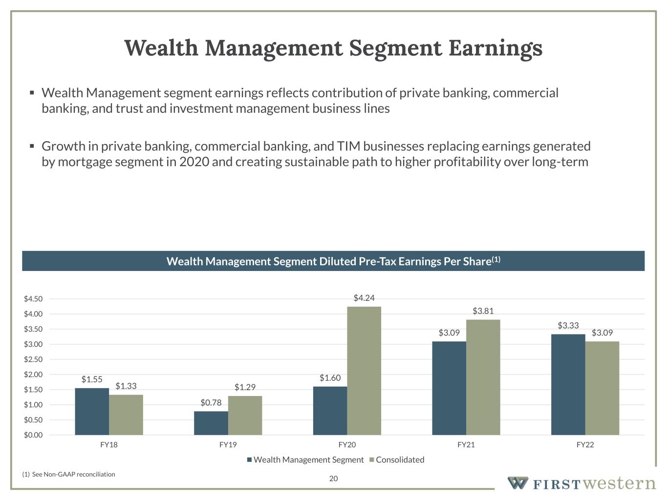 20 Wealth Management Segment Earnings (1) See Non-GAAP reconciliation $1.55 $0.78 $1.60 $3.09 $3.33 $1.33 $1.29 $4.24 $3.81 $3.09 $0.00 $0.50 $1.00 $1.50 $2.00 $2.50 $3.00 $3.50 $4.00 $4.50 FY18 FY19 FY20 FY21 FY22 Wealth Management Segment Consolidated ▪ Wealth Management segment earnings reflects contribution of private banking, commercial banking, and trust and investment management business lines ▪ Growth in private banking, commercial banking, and TIM businesses replacing earnings generated by mortgage segment in 2020 and creating sustainable path to higher profitability over long-term Wealth Management Segment Diluted Pre-Tax Earnings Per Share(1)