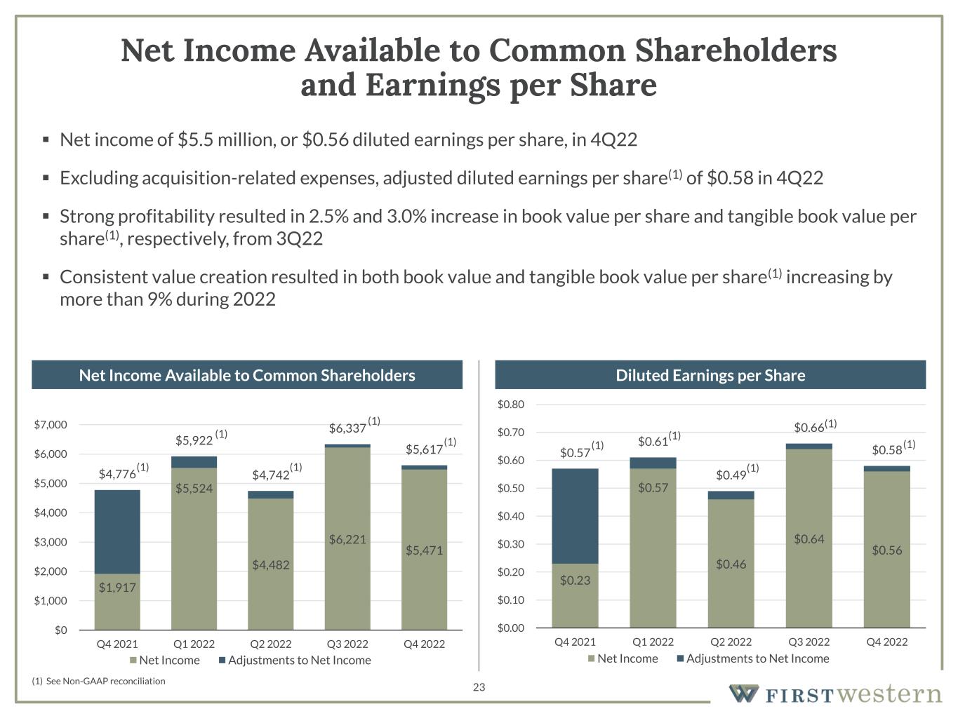 22 Overview of 4Q22 Strong Deposit Growth 4Q22 Earnings Well Balanced Loan Growth ▪ Despite tighter underwriting and pricing criteria, total loans held for investment increased at 21% annualized rate ▪ Increasing contributions from newer markets in Arizona, Wyoming and Montana ▪ Growth in most major loan categories ▪ Strong deposit growth significantly reduced loan-to-deposit ratio ▪ Total Capital Ratio increased 53 bps from end of prior quarter to 12.37% Increase in Liquidity and Capital ▪ Increased focus on deposit gathering resulted in 44% annualized growth in total deposits ▪ Newer markets making larger contributions to deposit growth ▪ Net income available to common shareholders of $5.5 million, or $0.56 per diluted share ▪ Excluding acquisition-related expenses, adjusted net income of $5.6 million, or $0.58 per diluted share(1) (1) See Non-GAAP reconciliation