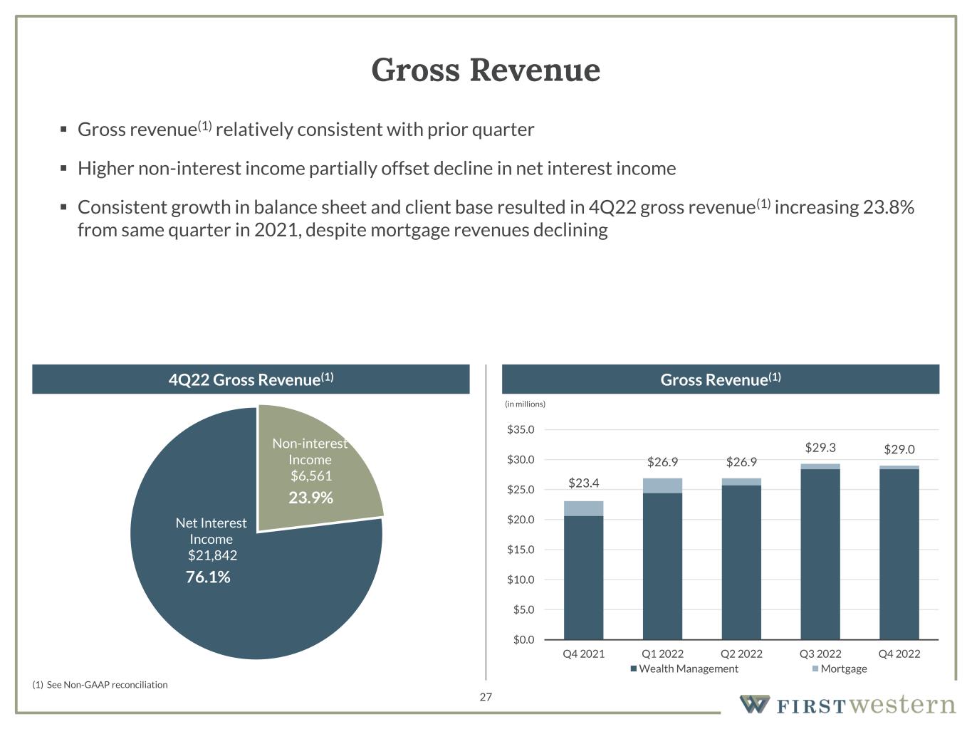 (1) See Non-GAAP reconciliation Gross Revenue ▪ Gross revenue(1) relatively consistent with prior quarter ▪ Higher non-interest income partially offset decline in net interest income ▪ Consistent growth in balance sheet and client base resulted in 4Q22 gross revenue(1) increasing 23.8% from same quarter in 2021, despite mortgage revenues declining Non-interest Income $6,561 Net Interest Income $21,842 23.9% 76.1% $23.4 $26.9 $26.9 $29.3 $29.0 $0.0 $5.0 $10.0 $15.0 $20.0 $25.0 $30.0 $35.0 Q4 2021 Q1 2022 Q2 2022 Q3 2022 Q4 2022 Wealth Management Mortgage (in millions) 4Q22 Gross Revenue(1) Gross Revenue(1) 27