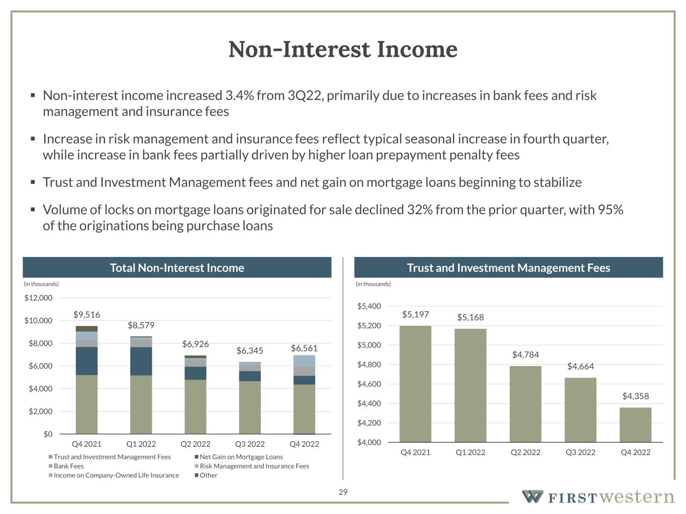28 Net Interest Income and Net Interest Margin ▪ Net interest income decreased to $21.8 million, or 4.6%, from $22.9 million in 3Q22, but increased 51.6% from $14.4 million in 4Q21 ▪ Net interest income decreased from 3Q22 due to higher interest expense resulting from strong deposit growth and increase in average cost of deposits ▪ Net interest margin, excluding PPP and purchase accretion (1), decreased 47 bps to 3.31%, due to increase in average cost of funds ▪ Net interest margin expected to decrease in 1Q23 $14,407 $18,305 $20,152 $22,906 $21,842 $0 $5,000 $10,000 $15,000 $20,000 $25,000 Q4 2021 Q1 2022 Q2 2022 Q3 2022 Q4 2022 2.95% 2.98% 3.35% 3.76% 3.32% 2.92% 2.87%(1) 3.30% 3.78% 3.31% -0.50% 0.00% 0.50% 1.00% 1.50% 2.00% 2.50% 3.00% 3.50% 4.00% Q4 2021 Q1 2022 Q2 2022 Q3 2022 Q4 2022 Net Interest Margin Adjusted Net Interest Margin (1) (1) (1) (1) (in thousands) (1) See Non-GAAP reconciliation Net Interest Income Net Interest Margin
