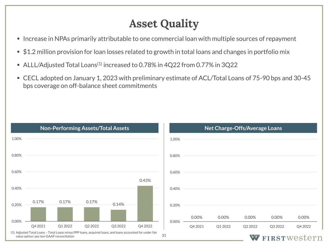 30 Non-Interest Expense and Efficiency Ratio ▪ Non-interest expense increased 3.3% from 3Q22 ▪ Increase primarily attributable to higher data processing fees and other operational costs related to enhancements to Trust and Investment Management platform ▪ Following investments in talent and technology in 2022, growth in non-interest expense expected to moderate in 2023 ▪ Non-interest expense for 1Q23 expected to range from $20-$21 million $3,700 $604 $424 $231 $272 $20,524 $19,358 $20,583 $19,260 $19,905 $0 $5,000 $10,000 $15,000 $20,000 $25,000 Q4 2021 Q1 2022 Q2 2022 Q3 2022 Q4 2022 Non-Interest Expense Adjustments to Non-Interest Expense (1) 71.77% 69.68% 74.85% 64.94% 67.66% 0% 20% 40% 60% 80% 100% Q4 2021 Q1 2022 Q2 2022 Q3 2022 Q4 2022 (1) See Non-GAAP reconciliation Total Non-Interest Expense Operating Efficiency Ratio(1) (in thousands) (1) (1) (1) (1) (1)