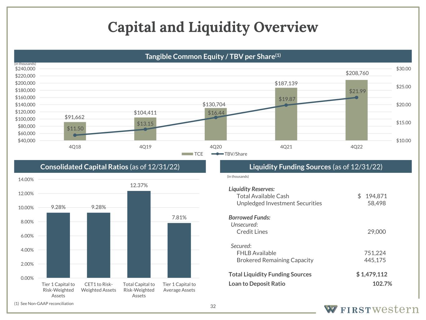 31 Asset Quality ▪ Increase in NPAs primarily attributable to one commercial loan with multiple sources of repayment ▪ $1.2 million provision for loan losses related to growth in total loans and changes in portfolio mix ▪ ALLL/Adjusted Total Loans(1) increased to 0.78% in 4Q22 from 0.77% in 3Q22 ▪ CECL adopted on January 1, 2023 with preliminary estimate of ACL/Total Loans of 75-90 bps and 30-45 bps coverage on off-balance sheet commitments 0.17% 0.17% 0.17% 0.14% 0.43% 0.00% 0.20% 0.40% 0.60% 0.80% 1.00% Q4 2021 Q1 2022 Q2 2022 Q3 2022 Q4 2022 0.00% 0.00% 0.00% 0.00% 0.00% 0.00% 0.20% 0.40% 0.60% 0.80% 1.00% Q4 2021 Q1 2022 Q2 2022 Q3 2022 Q4 2022 Non-Performing Assets/Total Assets Net Charge-Offs/Average Loans (1) Adjusted Total Loans – Total Loans minus PPP loans, acquired loans, and loans accounted for under fair value option; see non-GAAP reconciliation