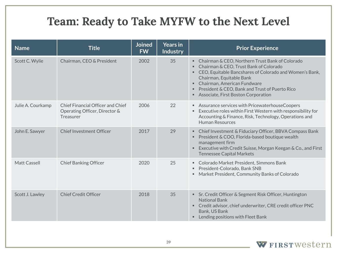 Name Title Joined FW Years in Industry Prior Experience Scott C. Wylie Chairman, CEO & President 2002 35 ▪ Chairman & CEO, Northern Trust Bank of Colorado ▪ Chairman & CEO, Trust Bank of Colorado ▪ CEO, Equitable Bancshares of Colorado and Women’s Bank, Chairman, Equitable Bank ▪ Chairman, American Fundware ▪ President & CEO, Bank and Trust of Puerto Rico ▪ Associate, First Boston Corporation Julie A. Courkamp Chief Financial Officer and Chief Operating Officer, Director & Treasurer 2006 22 ▪ Assurance services with PricewaterhouseCoopers ▪ Executive roles within First Western with responsibility for Accounting & Finance, Risk, Technology, Operations and Human Resources John E. Sawyer Chief Investment Officer 2017 29 ▪ Chief Investment & Fiduciary Officer, BBVA Compass Bank ▪ President & COO, Florida-based boutique wealth management firm ▪ Executive with Credit Suisse, Morgan Keegan & Co., and First Tennessee Capital Markets Matt Cassell Chief Banking Officer 2020 25 ▪ Colorado Market President, Simmons Bank ▪ President-Colorado, Bank SNB ▪ Market President, Community Banks of Colorado Scott J. Lawley Chief Credit Officer 2018 35 ▪ Sr. Credit Officer & Segment Risk Officer, Huntington National Bank ▪ Credit advisor, chief underwriter, CRE credit officer PNC Bank, US Bank ▪ Lending positions with Fleet Bank 39 Team: Ready to Take MYFW to the Next Level