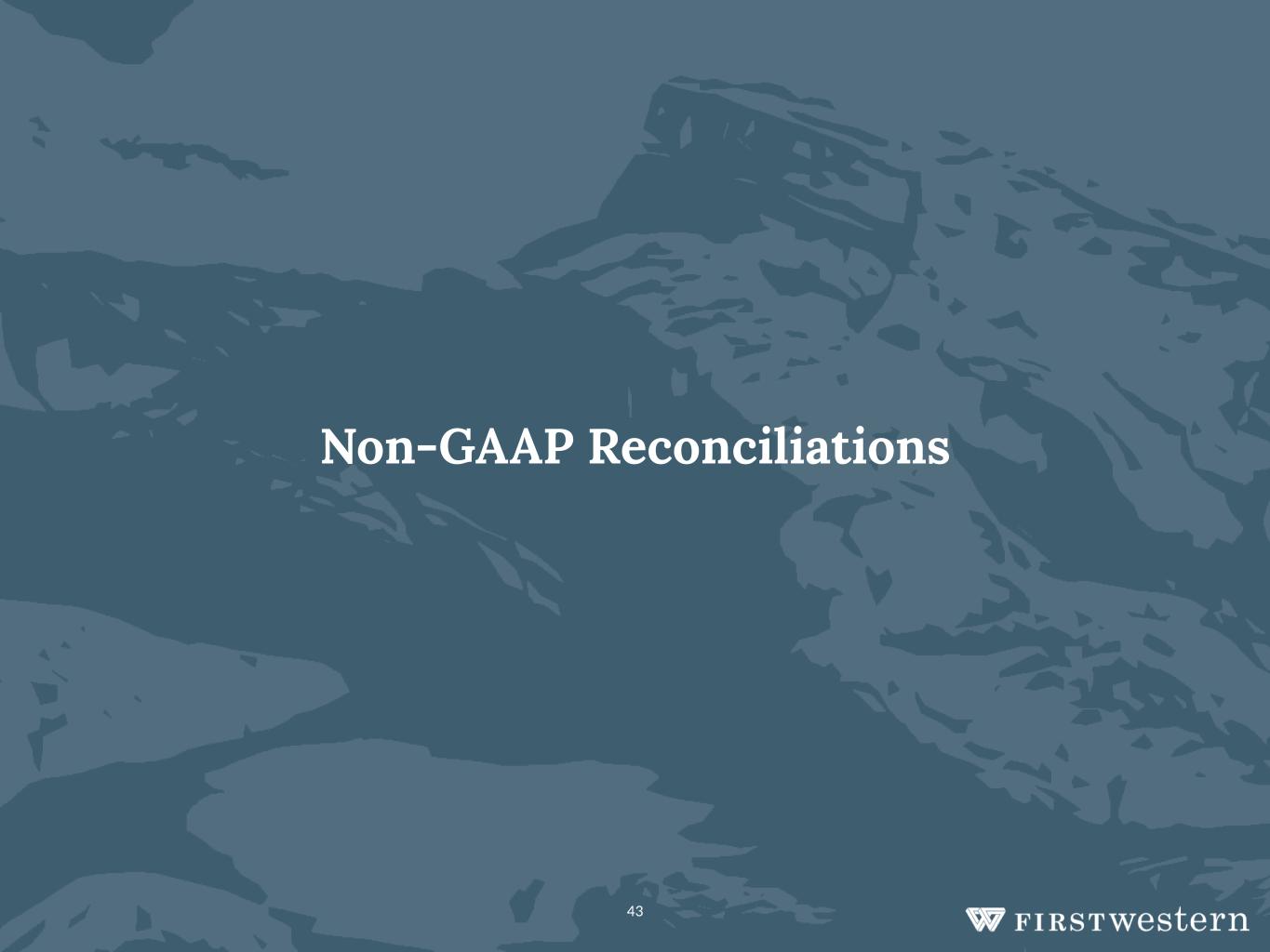 42 Organizational Structure Built for Scale Full Bank and Trust: ▪ Aspen, CO ▪ Boulder, CO ▪ Cherry Creek, CO ▪ Denver, CO ▪ DTC/Cherry Hills, CO ▪ Northern Colorado ▪ Jackson Hole, WY ▪ Rock Springs, WY ▪ Pinedale, WY ▪ Scottsdale, AZ ▪ Broomfield, CO ▪ Phoenix, AZ ▪ Vail Valley, Avon, CO Loan Production Offices: ▪ Bozeman, MT ▪ Ft. Collins, CO ▪ Greenwood Village, CO ▪ Phoenix, AZ Trust Offices: ▪ Century City, CA ▪ Laramie, WY ▪ Investment Management ▪ Fiduciary/ Trust ▪ Wealth Planning ▪ Retirement Services ▪ Insurance ▪ Mortgage Services ▪ Treasury Management First Western Profit Centers Product Groups Support Centers ▪ Finance & Accounting ▪ Risk & Compliance ▪ Enterprise Technology ▪ Human Capital ▪ Credit Analysis ▪ Bank & Trust/Investment Operations ▪ Marketing/Branding Big operating leverage from expert, high fixed cost teams Very profitable when mature
