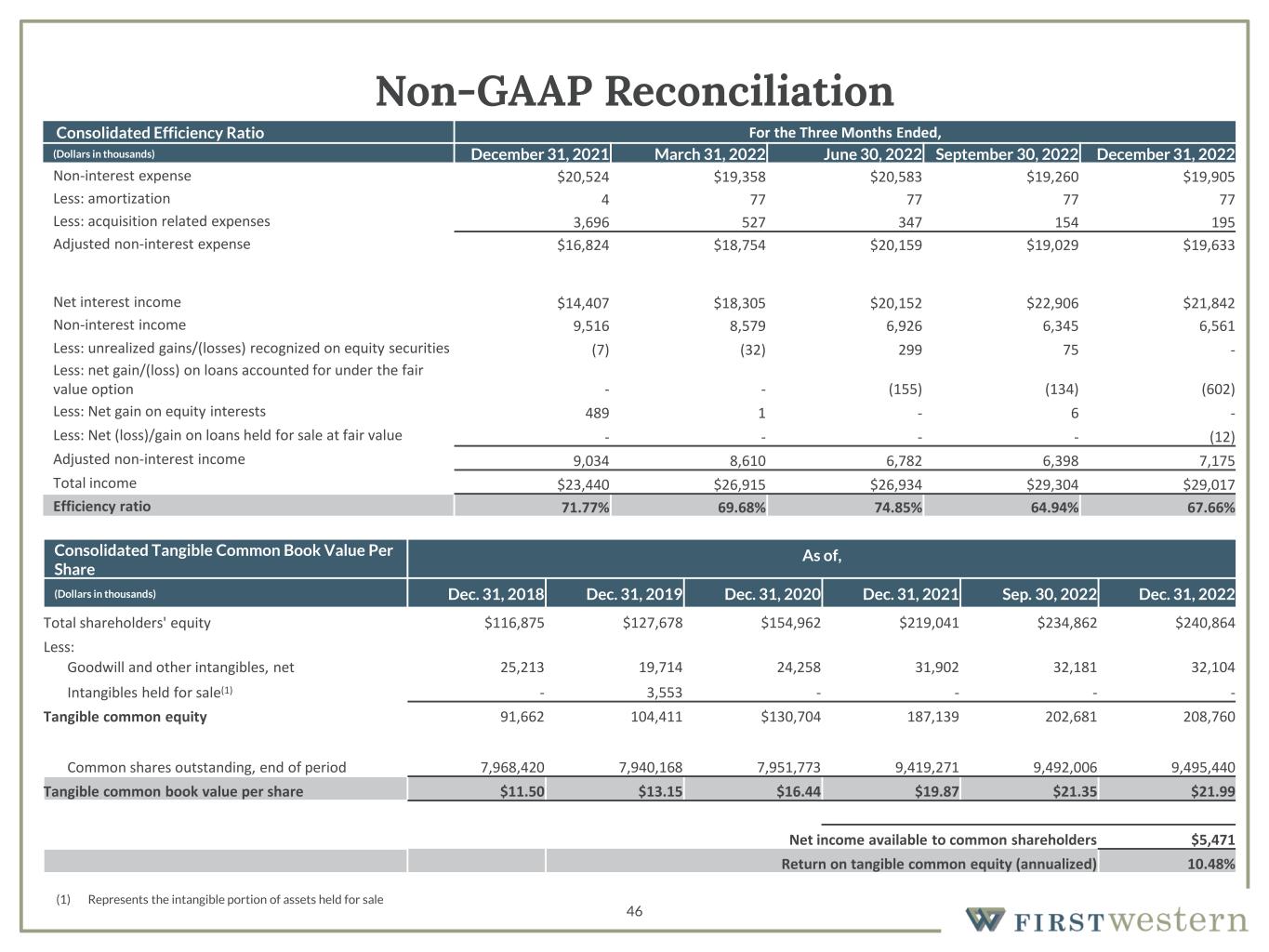 45 Non-GAAP Reconciliation Consolidated Efficiency Ratio For the Years Ended, (Dollars in thousands) 2016 2017 2018 2019 2020 2021 2022 Non-interest expense $49,823 $49,494 $50,182 $53,806 $59,552 $68,128 $79,106 Less: Amortization 747 784 831 374 14 17 308 Less: Acquisition related expenses - - - - 684 4,101 1,223 Less: Goodwill impairment - - - 1,572 - - - Less: Provision on other real estate owned - - - - 176 - - Less: Loss on assets held for sale - - - - 553 - - Plus: Gain on sale of LA fixed income team - - - - 62 - - Adjusted non-interest expense $49,076 $48,710 $49,351 $51,860 $58,187 $64,010 $77,575 Net interest income $24,457 $27,576 $30,624 $32,061 $46,102 $56,509 $83,204 Non-interest income 29,922 27,713 27,158 32,598 51,195 40,129 28,412 Less: Unrealized gains/(losses) recognized on equity securities - - (15) 21 15 (21) 342 Less: net gain/(loss) on loans accounted for under the fair value option - - - - - - (891) Less: Net gain on equity interests 114 81 - 119 - 489 7 Less: Net gain on sale of assets - - - 183 - - - Less: Net gain on loans held for sale - - - - - - (12) Total income $54,265 $55,208 $57,797 $64,336 $97,282 $96,170 $112,170 Efficiency ratio 90.4% 88.2% 85.4% 80.6% 59.8% 66.6% 69.2%
