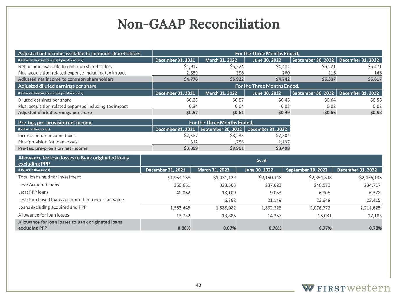 47 Non-GAAP Reconciliation Wealth Management Gross Revenue For the Three Months Ended, (Dollars in thousands) December 31, 2021 March 31, 2022 June 30, 2022 September 30, 2022 December 31, 2022 Total income before non-interest expense $20,612 $24,156 $25,282 $26,555 $26,623 Less: unrealized gains/(losses) recognized on equity securities (7) (32) 299 75 - Less: net gain/(loss) on loans accounted for under the fair value option - - (155) (134) (602) Less: net gain on equity interests 489 1 - 6 - Less: net (loss)/gain on loans held for sale at fair value - - - - (12) Plus: provision for loan loss 812 210 519 1,756 1,197 Gross revenue $20,942 $24,397 $25,657 $28,364 $28,434 Mortgage Gross Revenue For the Three Months Ended, (Dollars in thousands) December 31, 2021 March 31, 2022 June 30, 2022 September 30, 2022 December 31, 2022 Total income before non-interest expense $2,498 $2,518 $1,277 $940 $583 Plus: provision for loan loss - - - - - Gross revenue $2,498 $2,518 $1,277 $940 $583 Consolidated Gross Revenue For the Three Months Ended, (Dollars in thousands) December 31, 2021 March 31, 2022 June 30, 2022 September 30, 2022 December 31, 2022 Total income before non-interest expense $23,110 $26,674 $26,559 $27,495 $27,206 Less: unrealized gains/(losses) recognized on equity securities (7) (32) 299 75 - Less: net gain/(loss) on loans accounted for under the fair value option - - (155) (134) (602) Less: net gain on equity interests 489 1 - 6 - Less: net (loss)/gain on loans held for sale at fair value - - - - (12) Plus: provision for loan loss 812 210 519 1,756 1,197 Gross revenue $23,440 $26,915 $26,934 $29,304 $29,017 Gross Revenue excluding net gain on mortgage loans For the Three Months Ended, (Dollars in thousands) December 31, 2021 September 30, 2022 December 31, 2022 Gross revenue $23,440 $29,304 $29,017 Less: net gain on mortgage loans 2,470 885 775 Gross revenue excluding net gain on mortgage loans $20,970 $28,419 $28,242