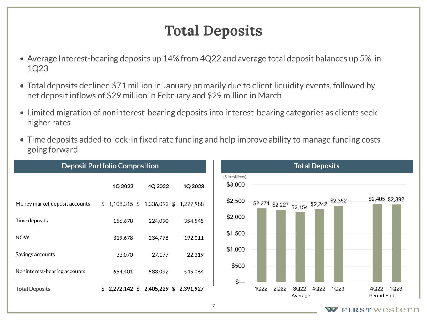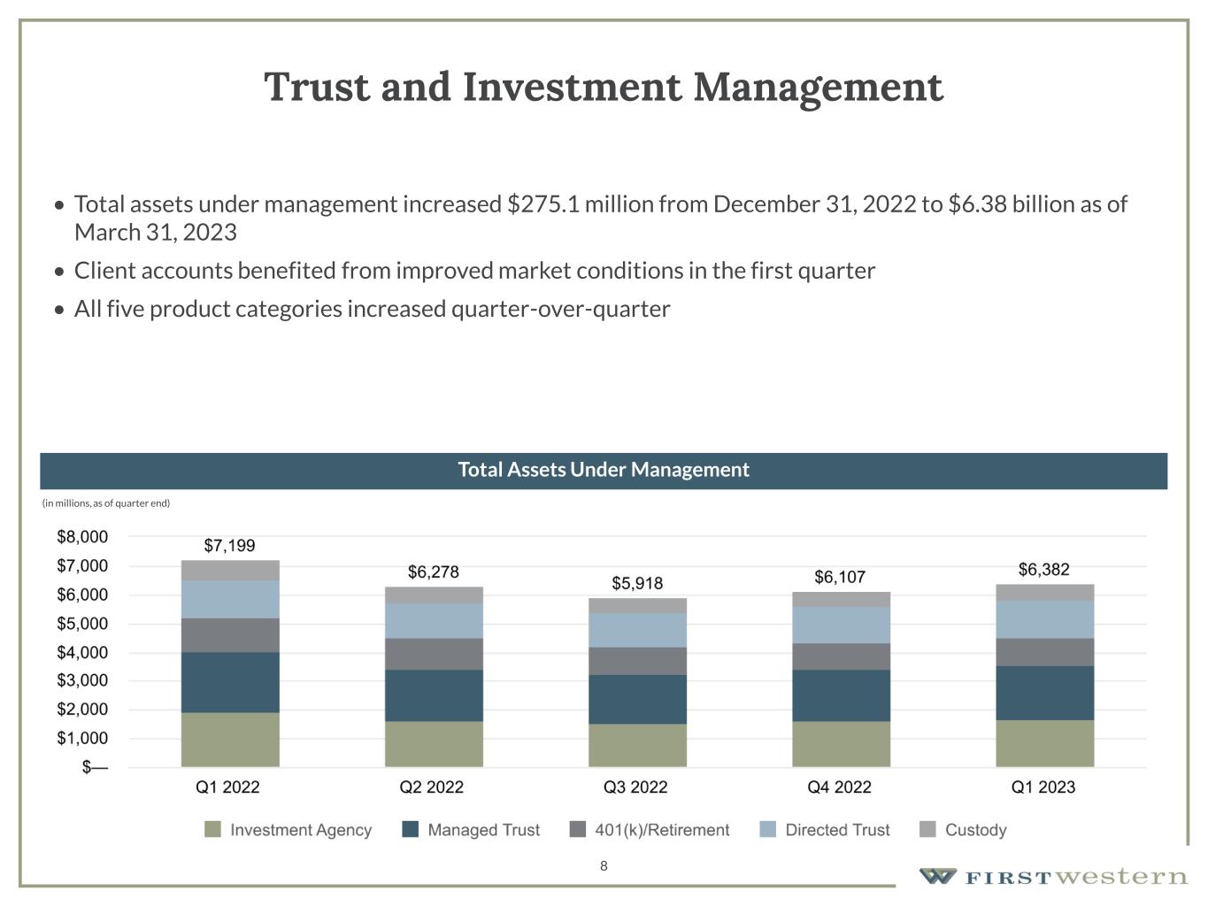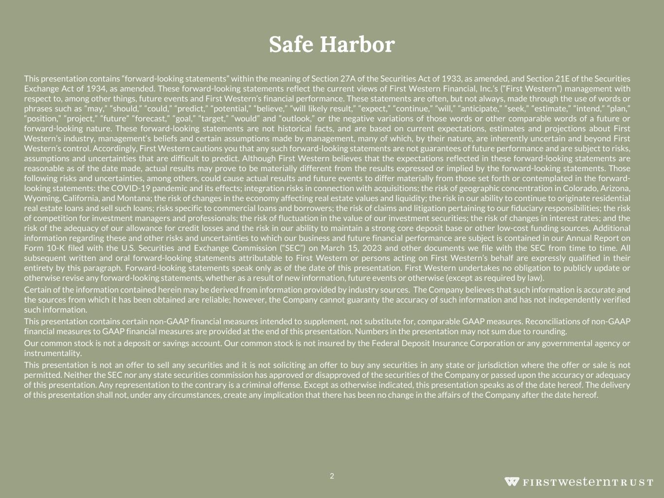 Safe Harbor 2 This presentation contains “forward-looking statements” within the meaning of Section 27A of the Securities Act of 1933, as amended, and Section 21E of the Securities Exchange Act of 1934, as amended. These forward-looking statements reflect the current views of First Western Financial, Inc.’s (“First Western”) management with respect to, among other things, future events and First Western’s financial performance. These statements are often, but not always, made through the use of words or phrases such as “may,” “should,” “could,” “predict,” “potential,” “believe,” “will likely result,” “expect,” “continue,” “will,” “anticipate,” “seek,” “estimate,” “intend,” “plan,” “position,” “project,” “future” “forecast,” “goal,” “target,” “would” and “outlook,” or the negative variations of those words or other comparable words of a future or forward-looking nature. These forward-looking statements are not historical facts, and are based on current expectations, estimates and projections about First Western’s industry, management’s beliefs and certain assumptions made by management, many of which, by their nature, are inherently uncertain and beyond First Western’s control. Accordingly, First Western cautions you that any such forward-looking statements are not guarantees of future performance and are subject to risks, assumptions and uncertainties that are difficult to predict. Although First Western believes that the expectations reflected in these forward-looking statements are reasonable as of the date made, actual results may prove to be materially different from the results expressed or implied by the forward-looking statements. Those following risks and uncertainties, among others, could cause actual results and future events to differ materially from those set forth or contemplated in the forward- looking statements: the COVID-19 pandemic and its effects; integration risks in connection with acquisitions; the risk of geographic concentration in Colorado, Arizona, Wyoming, California, and Montana; the risk of changes in the economy affecting real estate values and liquidity; the risk in our ability to continue to originate residential real estate loans and sell such loans; risks specific to commercial loans and borrowers; the risk of claims and litigation pertaining to our fiduciary responsibilities; the risk of competition for investment managers and professionals; the risk of fluctuation in the value of our investment securities; the risk of changes in interest rates; and the risk of the adequacy of our allowance for credit losses and the risk in our ability to maintain a strong core deposit base or other low-cost funding sources. Additional information regarding these and other risks and uncertainties to which our business and future financial performance are subject is contained in our Annual Report on Form 10-K filed with the U.S. Securities and Exchange Commission (“SEC”) on March 15, 2023 and other documents we file with the SEC from time to time. All subsequent written and oral forward-looking statements attributable to First Western or persons acting on First Western’s behalf are expressly qualified in their entirety by this paragraph. Forward-looking statements speak only as of the date of this presentation. First Western undertakes no obligation to publicly update or otherwise revise any forward-looking statements, whether as a result of new information, future events or otherwise (except as required by law). Certain of the information contained herein may be derived from information provided by industry sources. The Company believes that such information is accurate and the sources from which it has been obtained are reliable; however, the Company cannot guaranty the accuracy of such information and has not independently verified such information. This presentation contains certain non-GAAP financial measures intended to supplement, not substitute for, comparable GAAP measures. Reconciliations of non-GAAP financial measures to GAAP financial measures are provided at the end of this presentation. Numbers in the presentation may not sum due to rounding. Our common stock is not a deposit or savings account. Our common stock is not insured by the Federal Deposit Insurance Corporation or any governmental agency or instrumentality. This presentation is not an offer to sell any securities and it is not soliciting an offer to buy any securities in any state or jurisdiction where the offer or sale is not permitted. Neither the SEC nor any state securities commission has approved or disapproved of the securities of the Company or passed upon the accuracy or adequacy of this presentation. Any representation to the contrary is a criminal offense. Except as otherwise indicated, this presentation speaks as of the date hereof. The delivery of this presentation shall not, under any circumstances, create any implication that there has been no change in the affairs of the Company after the date hereof.