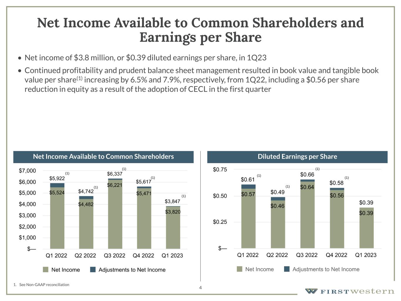 3 Overview of 1Q23 1Q23 Earnings Stable Balance Sheet • Strong relationship deposits with below peer level of uninsured deposits $891.5 million(2) or 37.3% in 1Q23 • $1.5 billion of readily available liquidity funding sources as of 1Q23 • Low amount of held-to-maturity securities at 2.7% of total assets, unrecognized losses of less than 3% of total Shareholders' Equity • Continued strong credit quality with immaterial losses • Minimal CRE exposure to non-owner occupied office space • Diverse client base with no single industry concentration Strong Fundamentals • Higher level of cash being held to temporarily increase balance sheet liquidity and flexibility • Total deposits increased during the months of February and March • Average Interest-bearing deposits up 14% from 4Q22 and average total deposit balances up 5% in 1Q23 • Disposition of non-relationship loans impacted loan growth in 1Q23, but improved risk profile of loan portfolio and positively impacted capital and liquidity • Net income available to common shareholders of $3.8 million, or $0.39 per diluted share • Pre-tax, pre-provision net income of $4.9 million(1) 1. See Non-GAAP Reconciliation 2. Calculated based off of uninsured deposits divided by total deposits.