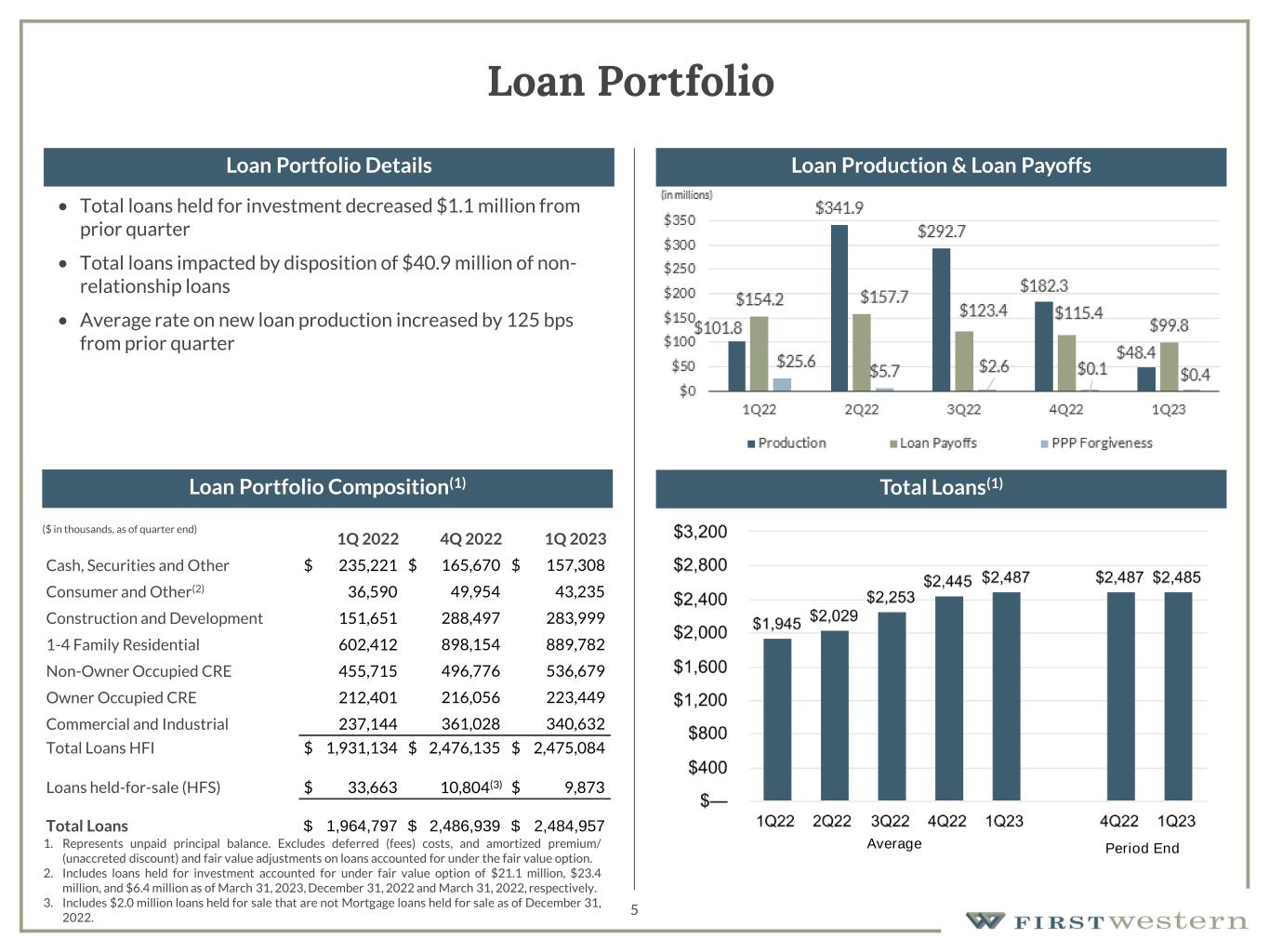 4 Net Income Available to Common Shareholders and Earnings per Share • Net income of $3.8 million, or $0.39 diluted earnings per share, in 1Q23 • Continued profitability and prudent balance sheet management resulted in book value and tangible book value per share(1) increasing by 6.5% and 7.9%, respectively, from 1Q22, including a $0.56 per share reduction in equity as a result of the adoption of CECL in the first quarter Net Income Available to Common Shareholders Diluted Earnings per Share 1. See Non-GAAP reconciliation (1) (1) (1) (1) (1) (1) (1) (1) (1)