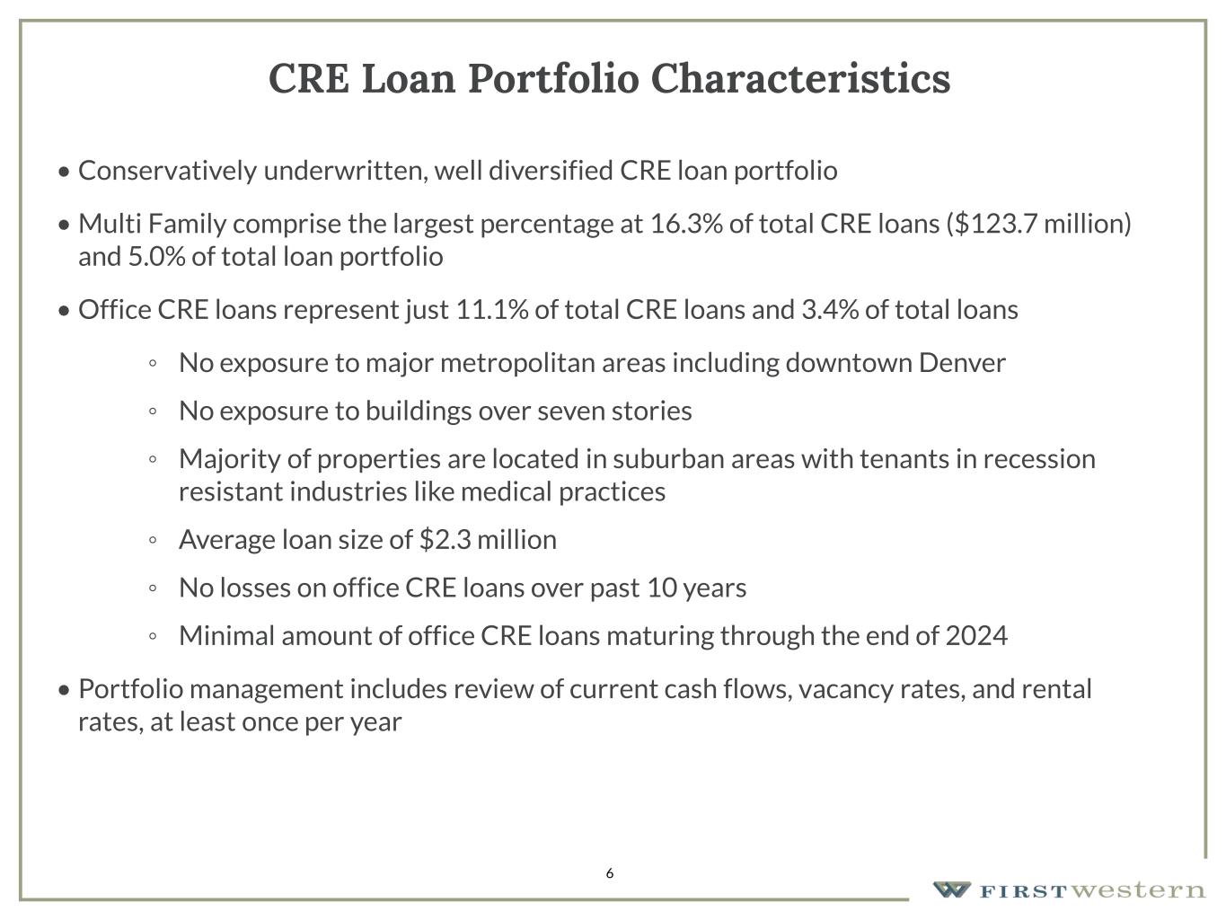 CRE Loan Portfolio Characteristics • Conservatively underwritten, well diversified CRE loan portfolio • Multi Family comprise the largest percentage at 16.3% of total CRE loans ($123.7 million) and 5.0% of total loan portfolio • Office CRE loans represent just 11.1% of total CRE loans and 3.4% of total loans ◦ No exposure to major metropolitan areas including downtown Denver ◦ No exposure to buildings over seven stories ◦ Majority of properties are located in suburban areas with tenants in recession resistant industries like medical practices ◦ Average loan size of $2.3 million ◦ No losses on office CRE loans over past 10 years ◦ Minimal amount of office CRE loans maturing through the end of 2024 • Portfolio management includes review of current cash flows, vacancy rates, and rental rates, at least once per year 6