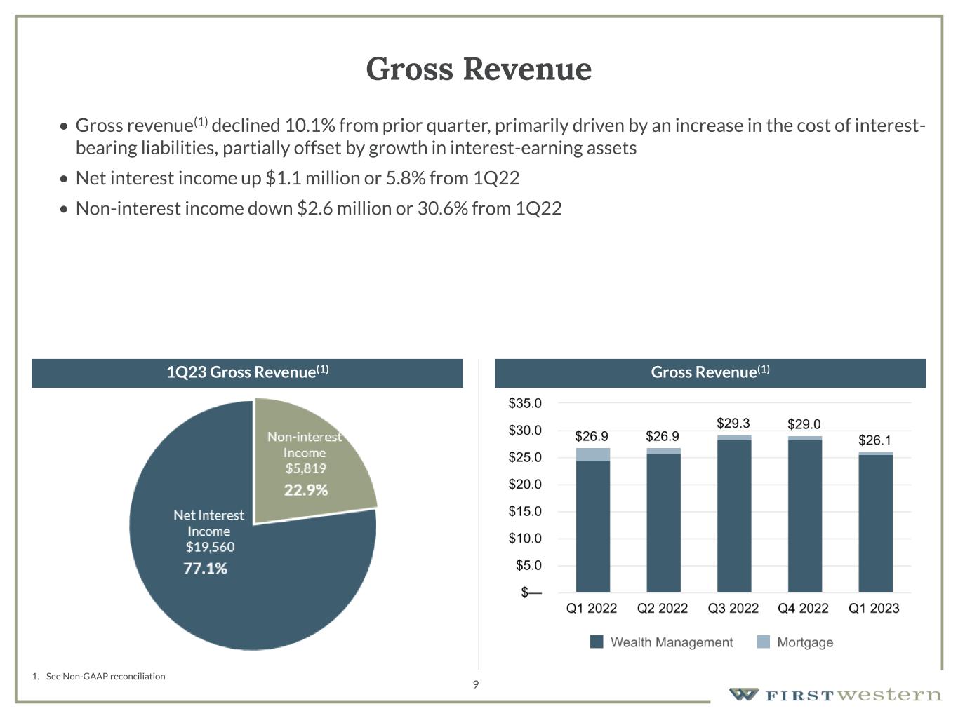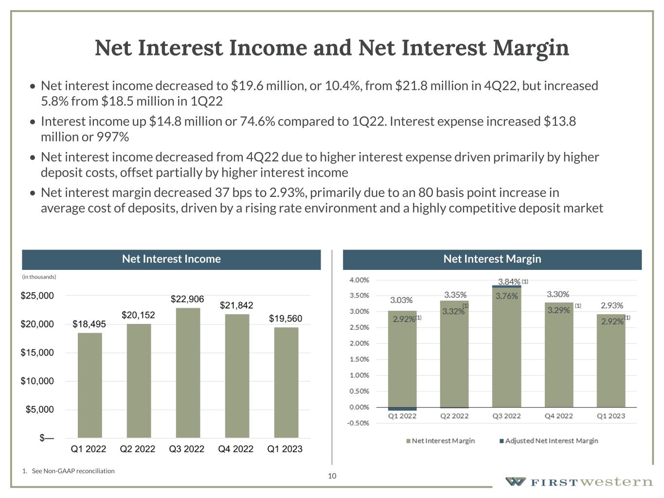 1. See Non-GAAP reconciliation Gross Revenue • Gross revenue(1) declined 10.1% from prior quarter, primarily driven by an increase in the cost of interest- bearing liabilities, partially offset by growth in interest-earning assets • Net interest income up $1.1 million or 5.8% from 1Q22 • Non-interest income down $2.6 million or 30.6% from 1Q22 1Q23 Gross Revenue(1) Gross Revenue(1) 9