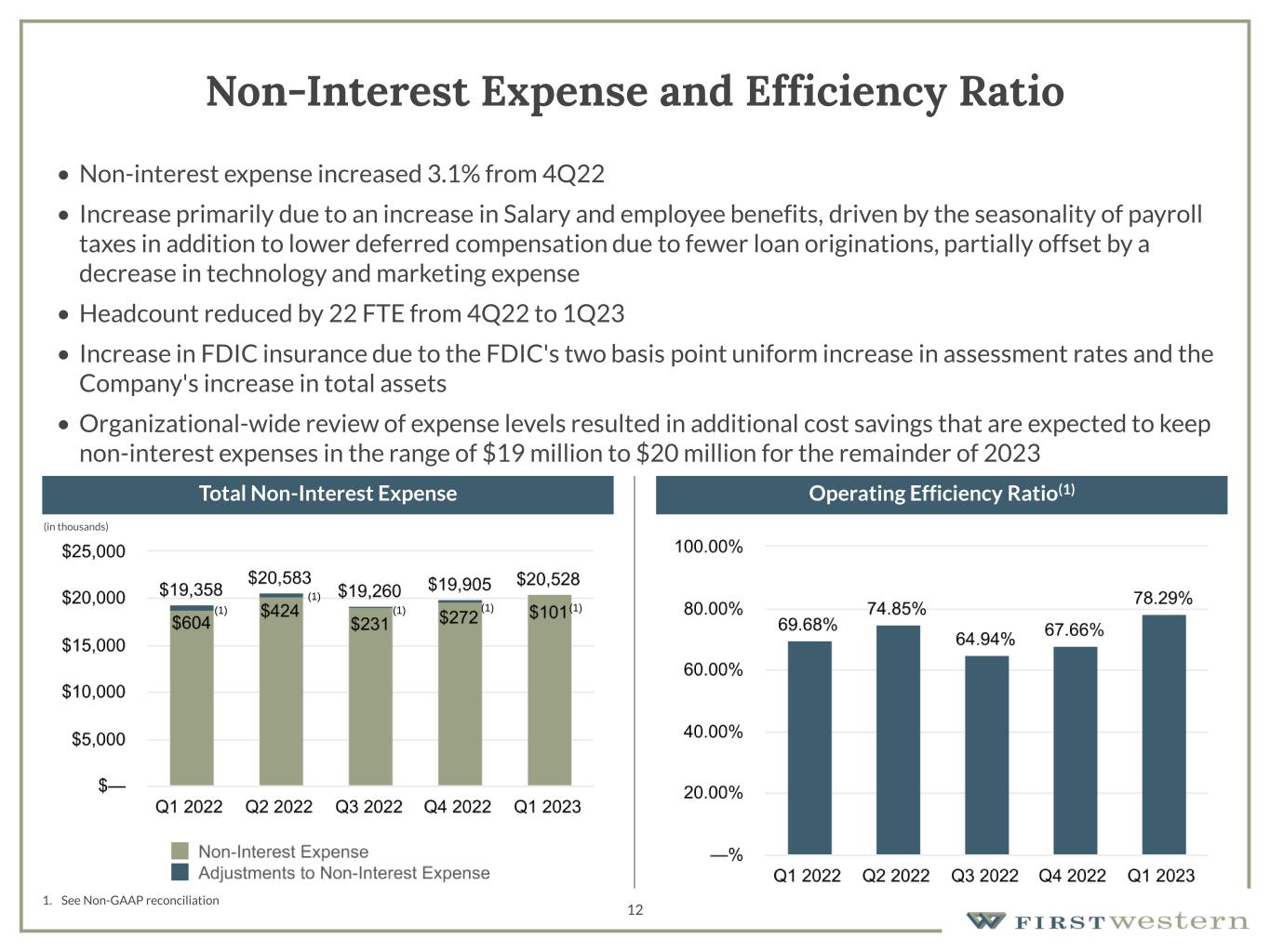 11 Non-Interest Income • Non-interest income decreased 11.3% from 4Q22, primarily due to seasonally lower risk management and insurance fees • Trust and Investment Management fees increased 6.4% from 4Q22 • Net gain on mortgage loans decreased from 1Q22 but increased from 4Q22 as the impact of loan production from expanded Arizona team more than offset seasonally slower production in Colorado • Volume of locks on mortgage loans originated for sale increased 41% from the prior quarter, with 96% of the originations being purchase loans (in thousands)(in thousands) Total Non-Interest Income Trust and Investment Management Fees