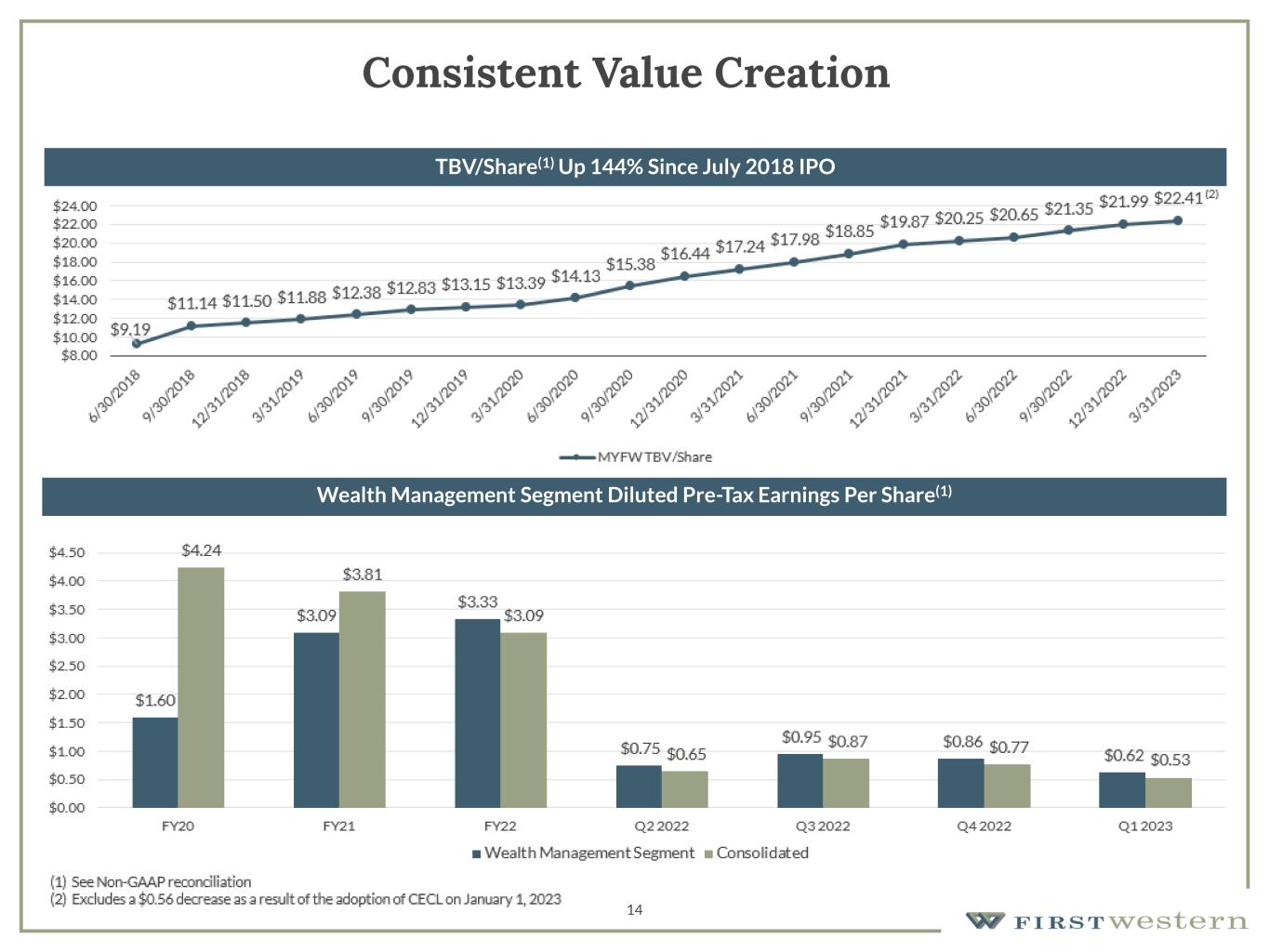 13 Asset Quality • CECL accounting standard adopted on January 1, 2023 with ACL/Total Loans of 84 bps and 47 bps coverage on off-balance sheet commitments. Total decrease to retained earnings of $5.3 million, net of tax impact ◦ Provision related to purchased loans upon adoption totaled $2.5 million • ACL/ Total Adjusted Loans(1) is 0.81% as of 1Q23 • $0.3 million release to provision for credit losses related to changes in volume and composition of loan portfolio, partially offset by increased provision on off-balance sheet commitments due to increased unfunded balances • Continue to experience immaterial amounts of credit losses Non-Performing Assets/Total Assets Net Charge-Offs/Average Loans 1. Adjusted Total Loans – Total Loans minus PPP loans and loans accounted for under fair value option; see non-GAAP reconciliation