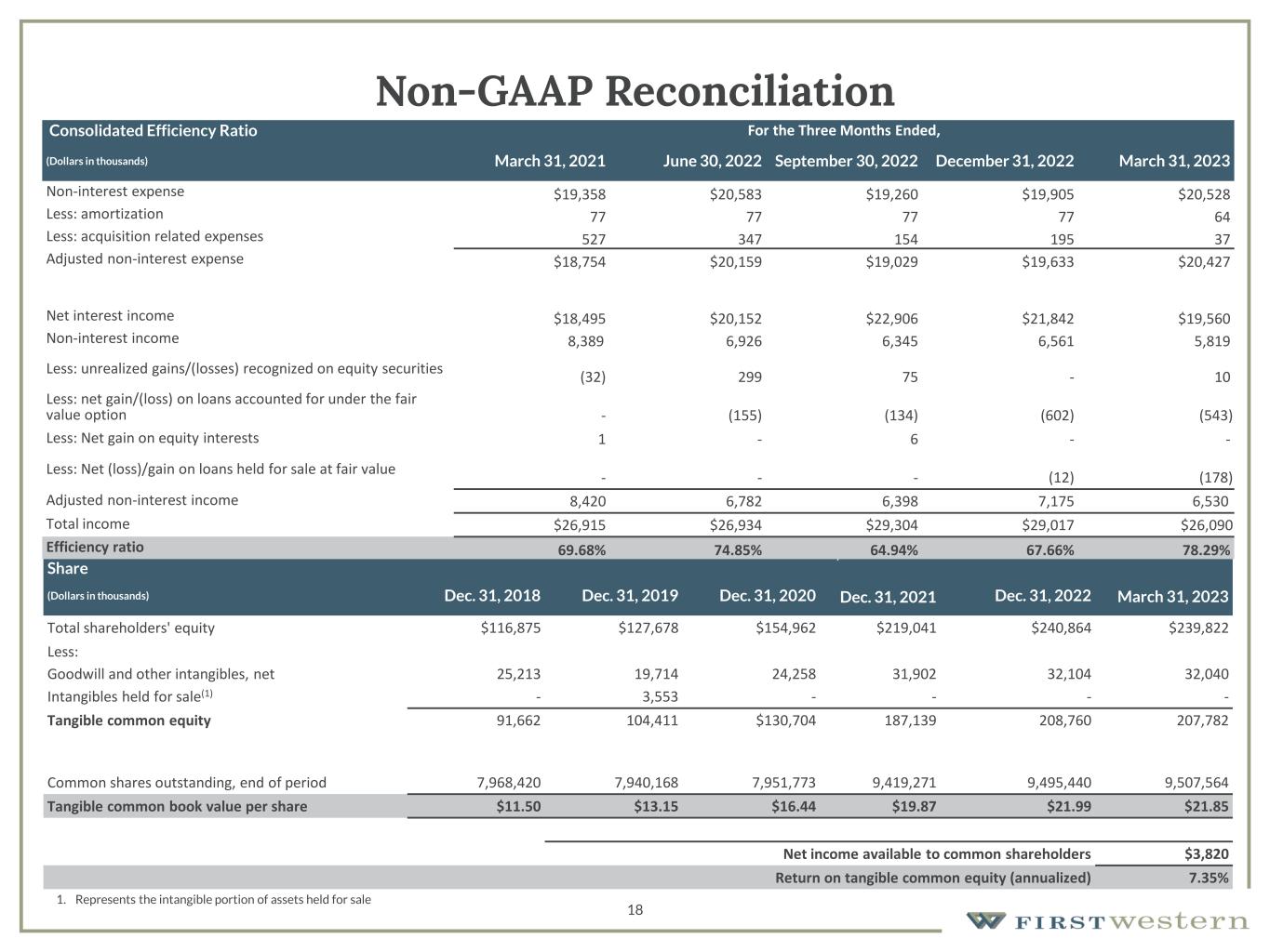 20 Non-GAAP Reconciliation Adjusted net income available to common shareholders For the Three Months Ended, (Dollars in thousands, except per share data) March 31, 2022 June 30, 2022 September 30, 2022 December 31, 2022 March 31, 2023 Net income available to common shareholders $5,524 $4,482 $6,221 $5,471 $3,820 Plus: acquisition related expense including tax impact 398 260 116 146 27 Adjusted net income to common shareholders $5,922 $4,742 $6,337 $5,617 $3,847 Adjusted diluted earnings per share For the Three Months Ended, (Dollars in thousands, except per share data) March 31, 2022 June 30, 2022 September 30, 2022 December 31, 2022 March 31, 2023 Diluted earnings per share $0.57 $0.46 $0.64 $0.56 $0.39 Plus: acquisition related expenses including tax impact 0.04 0.03 0.02 0.02 0.00 Adjusted diluted earnings per share $0.61 $0.49 $0.66 $0.58 $0.39 Allowance for credit losses to adjusted loans As of (Dollars in thousands) March 31, 2022 June 30, 2022 September 30, 2022 December 31, 2022 March 31, 2023 Total loans held for investment $1,931,134 $2,150,148 $2,354,898 $2,476,135 $2,475,084 Less: Acquired loans 323,563 287,623 248,573 234,717 - (1) Less: PPP loans 13,109 9,053 6,905 6,378 5,967 Less: Purchased loans accounted for under fair value 6.368 21,149 22,648 23,415 21,052 Loans excluding acquired and PPP 1,588,094 1,832,323 2,076,772 2,211,625 2,448,065 Allowance for credit losses 13,885 14,357 16,081 17,183 19,843 Allowance for credit losses to loans excluding PPP 0.87% 0.78% 0.77% 0.78% 0.81 % Pre-tax, pre-provision net income For the Three Months Ended, (Dollars in thousands) March 31, 2022 December 31, 2022 March 31, 2023 Income before income taxes $7,316 $7,301 $5,161 Plus: provision for credit losses 210 1,197 (310) Pre-tax, pre-provision net income $7,526 $8,498 $4,851 1. Subsequent to the adoption of CECL on January 1, 2023, acquired loans are included in the Allowance for Credit Losses and therefore are no longer excluded from the total adjusted loan calculation.