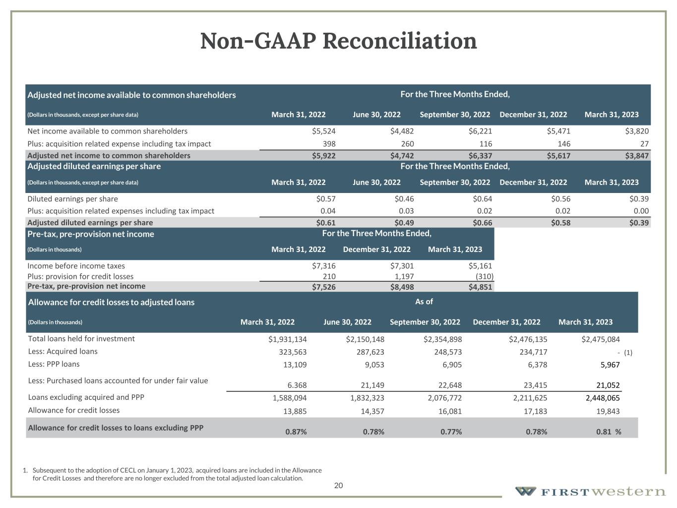 19 Non-GAAP Reconciliation Wealth Management Gross Revenue For the Three Months Ended, (Dollars in thousands) March 31, 2022 June 30, 2022 September 30, 2022 December 31, 2022 March 31, 2023 Total income before non-interest expense $24,156 $25,282 $26,555 $26,623 $25,092 Less: unrealized gains/(losses) recognized on equity securities (32) 299 75 - 10 Less: net gain/(loss) on loans accounted for under the fair value option - (155) (134) (602) (543) Less: net gain on equity interests 1 - 6 - - Less: net (loss)/gain on loans held for sale at fair value - - - (12) (178) Plus: provision for credit losses 210 519 1,756 1,197 (310) Gross revenue $24,397 $25,657 $28,364 $28,434 $25,493 Mortgage Gross Revenue For the Three Months Ended, (Dollars in thousands) March 31, 2022 June 30, 2022 September 30, 2022 December 31, 2022 March 31, 2023 Total income before non-interest expense $2,518 $1,277 $940 $583 $597 Plus: provision for credit losses - - - - - Gross revenue $2,518 $1,277 $940 $583 $597 Consolidated Gross Revenue For the Three Months Ended, (Dollars in thousands) March 31, 2022 June 30, 2022 September 30, 2022 December 31, 2022 March 31, 2023 Total income before non-interest expense $26,674 $26,559 $27,495 $27,206 $25,689 Less: unrealized gains/(losses) recognized on equity securities (32) 299 75 - 10 Less: net gain/(loss) on loans accounted for under the fair value option - (155) (134) (602) (543) Less: net gain on equity interests 1 - 6 - - Less: net (loss)/gain on loans held for sale at fair value - - - (12) (178) Plus: provision for credit losses 210 519 1,756 1,197 (310) Gross revenue $26,915 $26,934 $29,304 $29,017 $26,090 Gross Revenue excluding net gain on mortgage loans For the Three Months Ended, (Dollars in thousands) March 31, 2022 December 31, 2022 March 31, 2023 Gross revenue $26,915 $29,017 $26,090 Less: net gain on mortgage loans 2,303 775 1,019 Gross revenue excluding net gain on mortgage loans $24,612 $28,242 $25,071