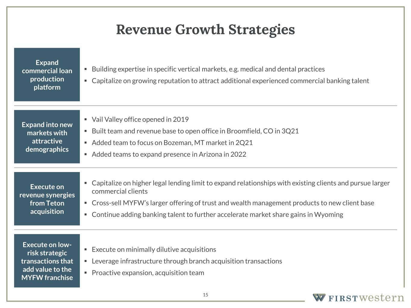 14 Success in Expansion and Acquisition Growth 2006 – 2010 (3) ▪ Boulder, CO ▪ Century City, CA ▪ Scottsdale, AZ 2011 – 2015 (6) ▪ Aspen, CO ▪ DTC/Cherry Hills, CO ▪ Fort Collins, CO ▪ Jackson Hole, WY ▪ Laramie, WY(4) ▪ Phoenix, AZ 2016 – 2020 (4) ▪ Broomfield, CO (2021) ▪ Greenwood Village, CO ▪ Lone Tree, CO(2) ▪ Vail Valley, CO 2002 – 2005 (3) ▪ Cherry Creek, CO ▪ Denver, CO ▪ Northern Colorado, CO 2002 – 2005 (5) ▪ Westcor Insurance Group, Inc. ▪ Poudre River Valley Trust Co. ▪ Sprout & Associates, Inc. ▪ Sterling Partners ▪ Silversmith Financial Corp 2006 – 2010 (4) ▪ Reber/Russell Company ▪ Ryder, Stilwell Inc. ▪ Asset Purchase – Financial Management Advisors, LLC ▪ Asset Purchase – GKM Advisors, LLC 2011 – 2015 (1) ▪ Trust Department Assets – First National Bank of Wyoming 2016 – 2020 (2) ▪ Asset Purchase – EMC Holdings, Inc. ▪ Branch Purchase & Assumption from Simmons Bank O ff ic e O p e n in g s A cq u is it io n s 2002 2023 3 5 6 9 12 10 16 12 # #Total Acquisitions Total Offices 18 13 2021 - 2022 (1) ▪ Teton Financial Services, Inc. 2021 - 2022 (5) ▪ Jackson Hole, WY(1) ▪ Pinedale, WY(1) ▪ Rock Springs, WY(1) ▪ Bozeman, MT ▪ Phoenix, AZ(3) (1) Added through the Teton Financial Services, Inc. acquisition. Jackson Hole offices were consolidated in May 2022 (2) Lone Tree branch closed in 2Q2022 (3) Phoenix loan production office opened in 4Q2022 (4) Laramie trust office closed 1Q2023