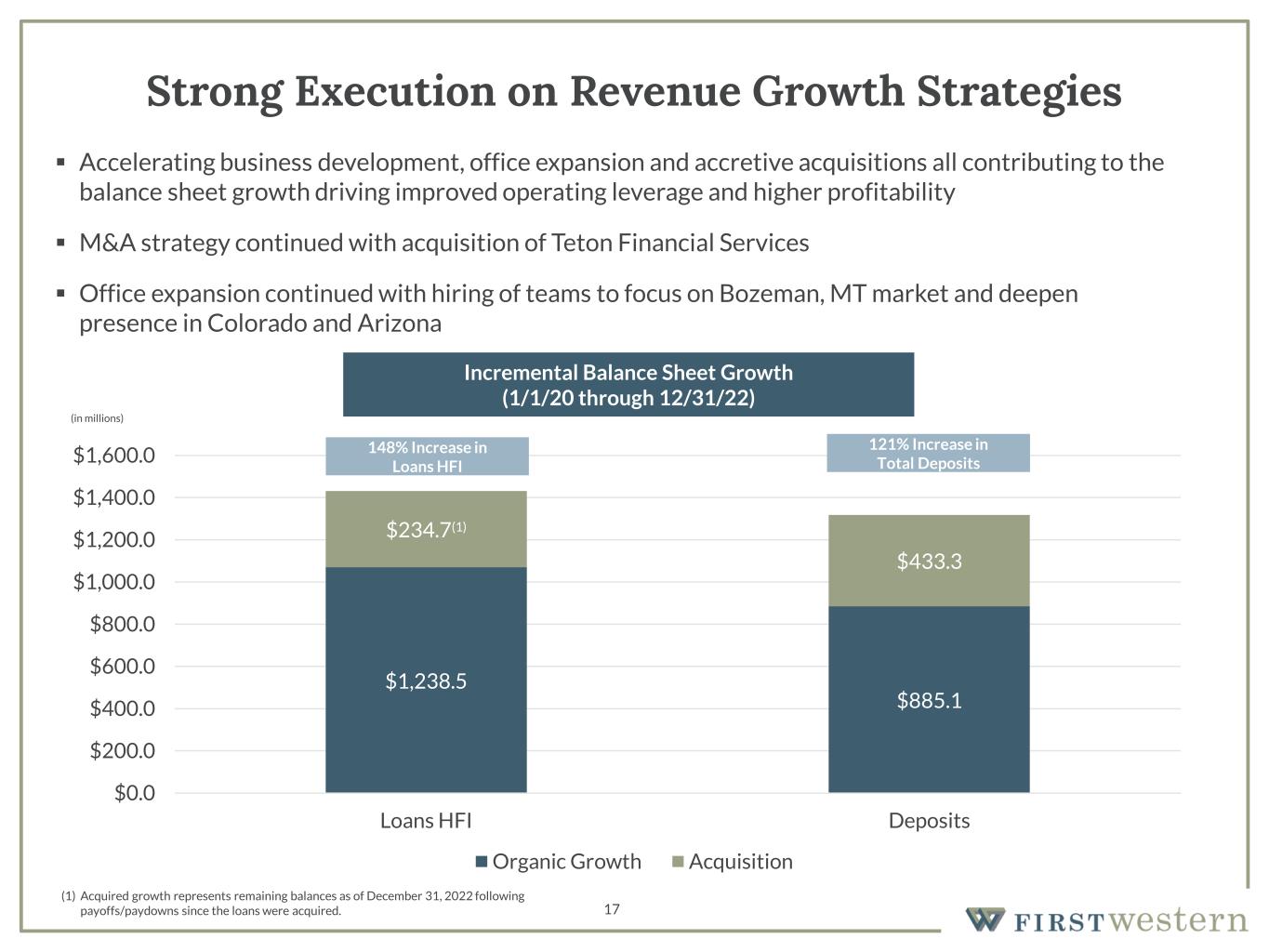 16 Recent M&A Transactions Branch Purchase and Assumption Whole Bank Acquisition ▪ Closed on May 18, 2020 ▪ Acquisition of all of the Denver locations of Simmons Bank (three branches and one loan production office) ▪ Assumed $63 million in deposits and $120 million in loans related to the acquired locations ▪ Added scale, an attractive client base, and commercial banking talent Transaction Overview Financial Impact ▪ Mid-teens earnings accretion in 2021 Transaction Overview ▪ Closed on December 31, 2021 ▪ Acquisition of Teton Financial Services Inc., the holding company for Rocky Mountain Bank ▪ Expanded First Western’s footprint and market share in Wyoming where favorable trust, estate and tax laws align well with private banking and investment management business model ▪ Added $379 million in deposits and $252 million in loans ▪ Added scale and improves operating efficiencies Financial Impact ▪ High single-digit earnings accretion in 2022 ▪ Immediately accretive to TBV/share upon closing ▪ Added low-cost deposits and higher-yielding loans that will positively impact net interest margin
