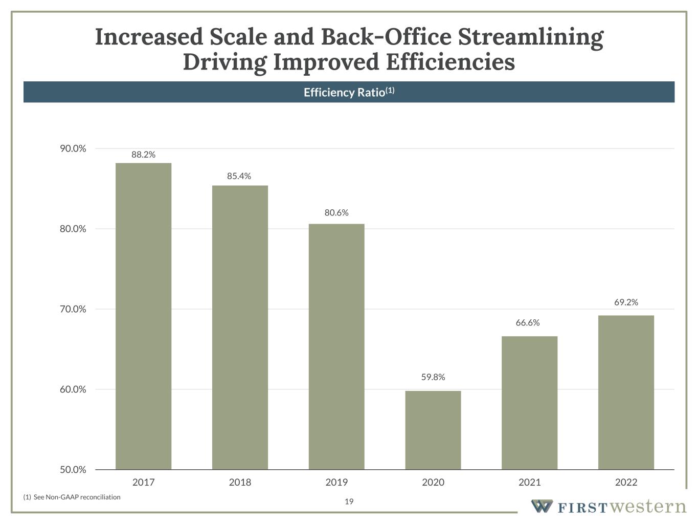 18 Accelerating Business Development Trends Capital raised in July 2018 IPO has allowed for increased business development activities $227.9 $268.2 $225.6 $317.9 $691.7 $561.2 $918.7 $0.0 $100.0 $200.0 $300.0 $400.0 $500.0 $600.0 $700.0 $800.0 $900.0 $1,000.0 2016 2017 2018 2019 2020 2021 2022 $44.0 $62.2 $121.6 $149.0 $467.9 $206.6 $199.5 $0.0 $100.0 $200.0 $300.0 $400.0 $500.0 2016 2017 2018 2019 2020 2021 2022 (1) Excluding PPP loans (2) Excluding acquired deposits (in millions)(in millions) New Loan Production(1) Net Deposit Growth(2)