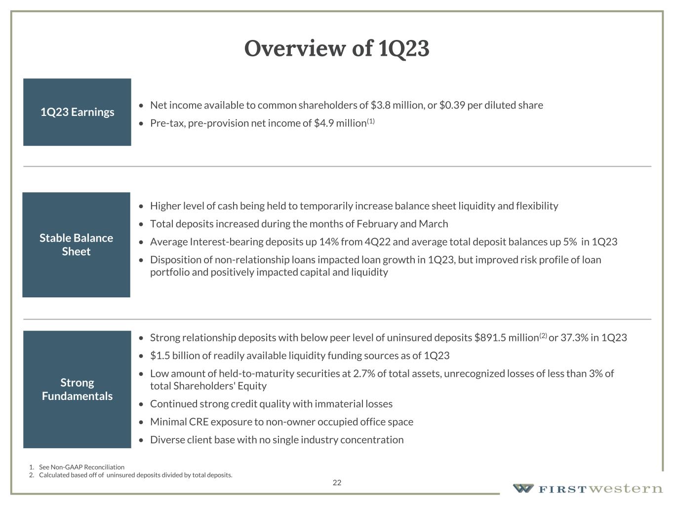 22 Overview of 1Q23 1Q23 Earnings Stable Balance Sheet • Strong relationship deposits with below peer level of uninsured deposits $891.5 million(2) or 37.3% in 1Q23 • $1.5 billion of readily available liquidity funding sources as of 1Q23 • Low amount of held-to-maturity securities at 2.7% of total assets, unrecognized losses of less than 3% of total Shareholders' Equity • Continued strong credit quality with immaterial losses • Minimal CRE exposure to non-owner occupied office space • Diverse client base with no single industry concentration Strong Fundamentals • Higher level of cash being held to temporarily increase balance sheet liquidity and flexibility • Total deposits increased during the months of February and March • Average Interest-bearing deposits up 14% from 4Q22 and average total deposit balances up 5% in 1Q23 • Disposition of non-relationship loans impacted loan growth in 1Q23, but improved risk profile of loan portfolio and positively impacted capital and liquidity • Net income available to common shareholders of $3.8 million, or $0.39 per diluted share • Pre-tax, pre-provision net income of $4.9 million(1) 1. See Non-GAAP Reconciliation 2. Calculated based off of uninsured deposits divided by total deposits.