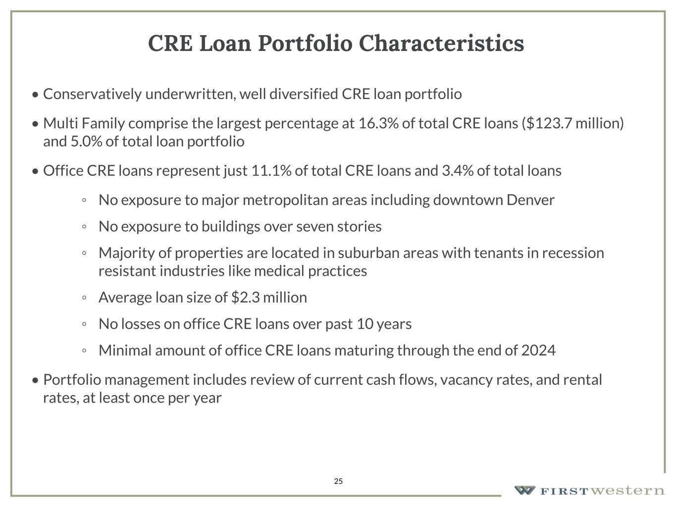 CRE Loan Portfolio Characteristics • Conservatively underwritten, well diversified CRE loan portfolio • Multi Family comprise the largest percentage at 16.3% of total CRE loans ($123.7 million) and 5.0% of total loan portfolio • Office CRE loans represent just 11.1% of total CRE loans and 3.4% of total loans ◦ No exposure to major metropolitan areas including downtown Denver ◦ No exposure to buildings over seven stories ◦ Majority of properties are located in suburban areas with tenants in recession resistant industries like medical practices ◦ Average loan size of $2.3 million ◦ No losses on office CRE loans over past 10 years ◦ Minimal amount of office CRE loans maturing through the end of 2024 • Portfolio management includes review of current cash flows, vacancy rates, and rental rates, at least once per year 25