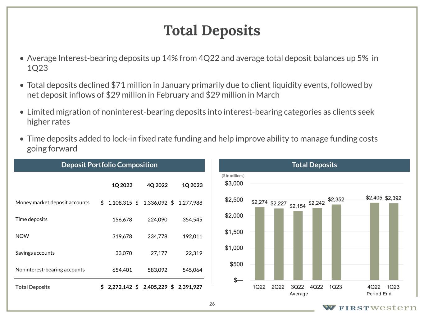 26 Total Deposits • Average Interest-bearing deposits up 14% from 4Q22 and average total deposit balances up 5% in 1Q23 • Total deposits declined $71 million in January primarily due to client liquidity events, followed by net deposit inflows of $29 million in February and $29 million in March • Limited migration of noninterest-bearing deposits into interest-bearing categories as clients seek higher rates • Time deposits added to lock-in fixed rate funding and help improve ability to manage funding costs going forward 1Q 2022 4Q 2022 1Q 2023 Money market deposit accounts $ 1,108,315 $ 1,336,092 $ 1,277,988 Time deposits 156,678 224,090 354,545 NOW 319,678 234,778 192,011 Savings accounts 33,070 27,177 22,319 Noninterest-bearing accounts 654,401 583,092 545,064 Total Deposits $ 2,272,142 $ 2,405,229 $ 2,391,927 Deposit Portfolio Composition Total Deposits Average Period End