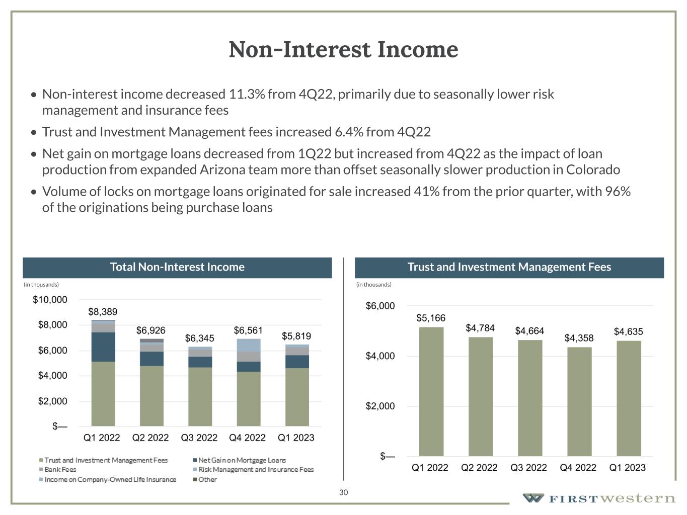 30 Non-Interest Income • Non-interest income decreased 11.3% from 4Q22, primarily due to seasonally lower risk management and insurance fees • Trust and Investment Management fees increased 6.4% from 4Q22 • Net gain on mortgage loans decreased from 1Q22 but increased from 4Q22 as the impact of loan production from expanded Arizona team more than offset seasonally slower production in Colorado • Volume of locks on mortgage loans originated for sale increased 41% from the prior quarter, with 96% of the originations being purchase loans (in thousands)(in thousands) Total Non-Interest Income Trust and Investment Management Fees